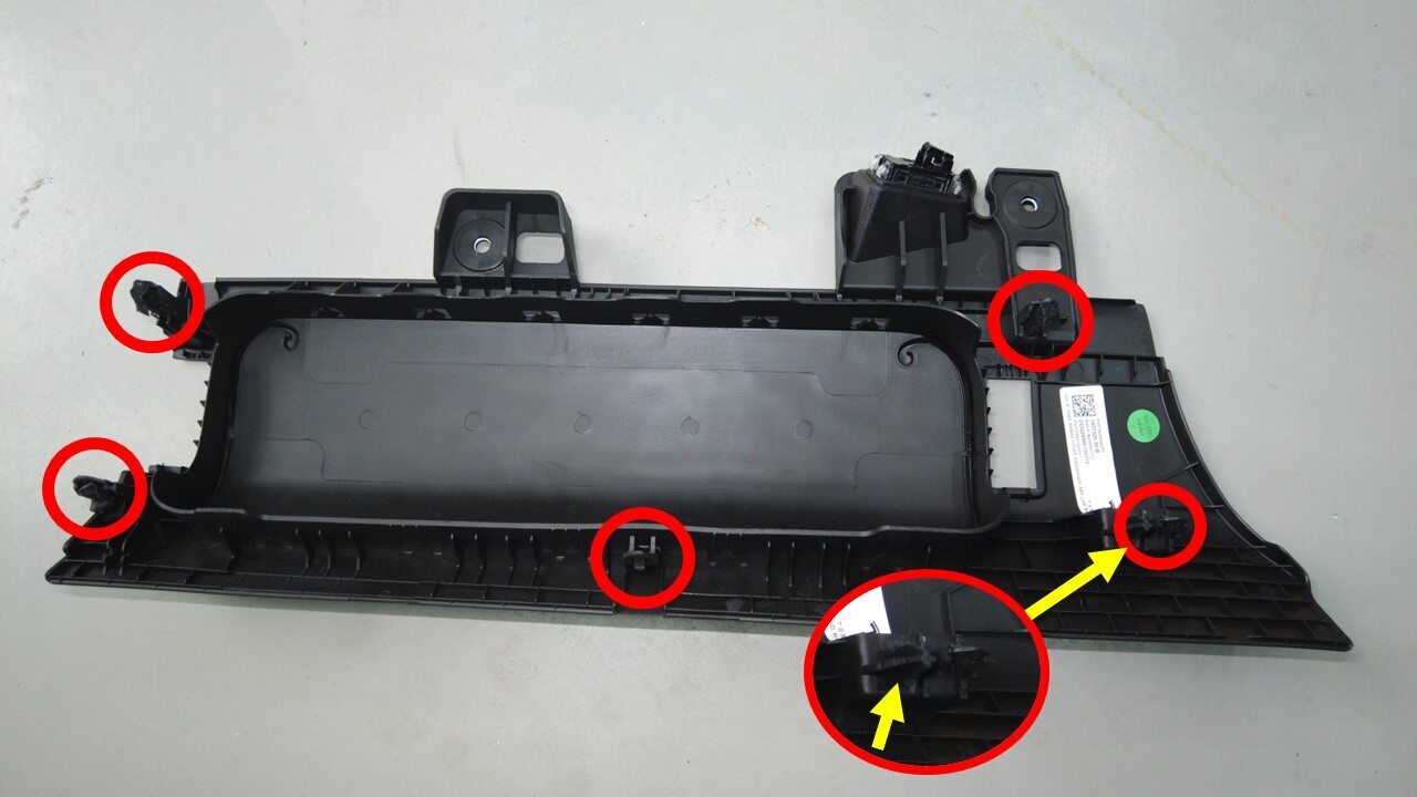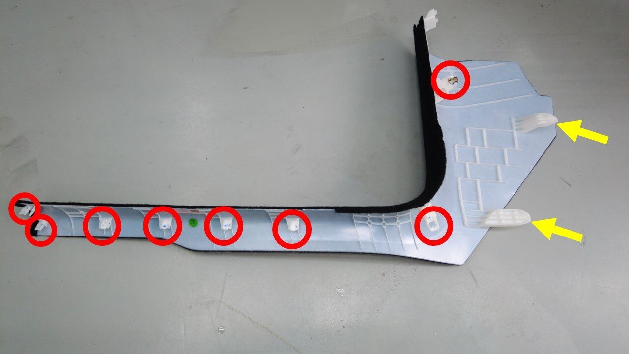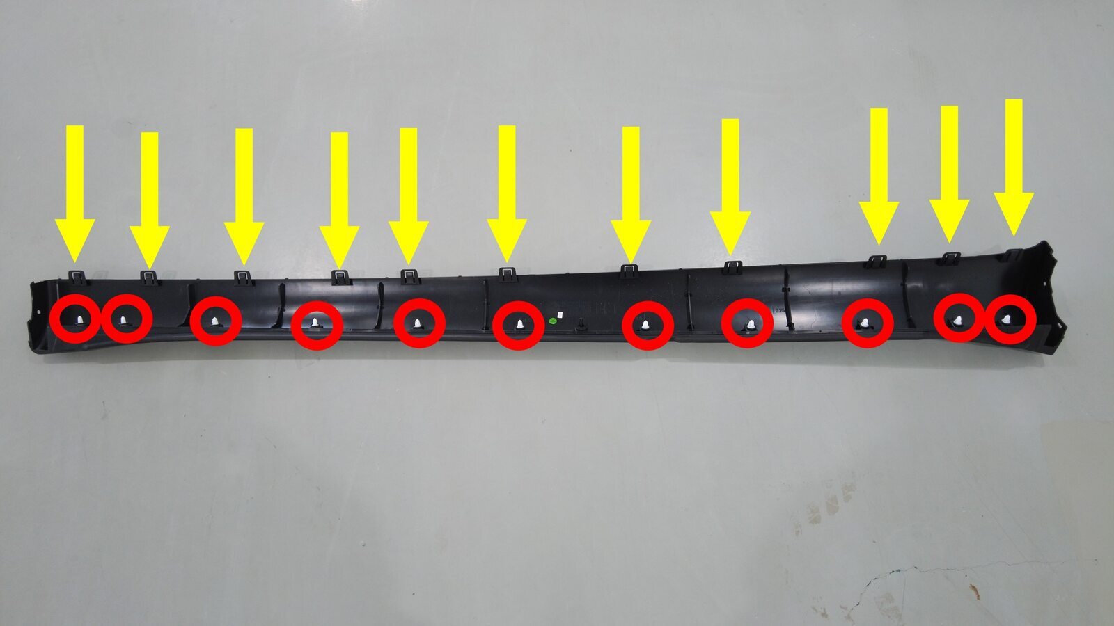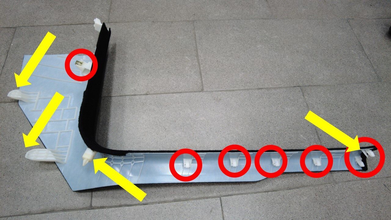 注7 个卡子,2 个导片;向上拉动饰板以松开所有卡子