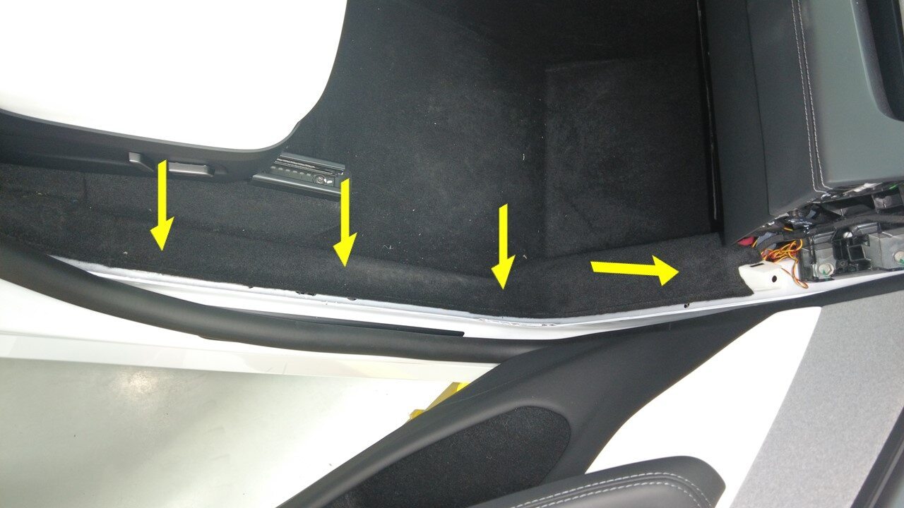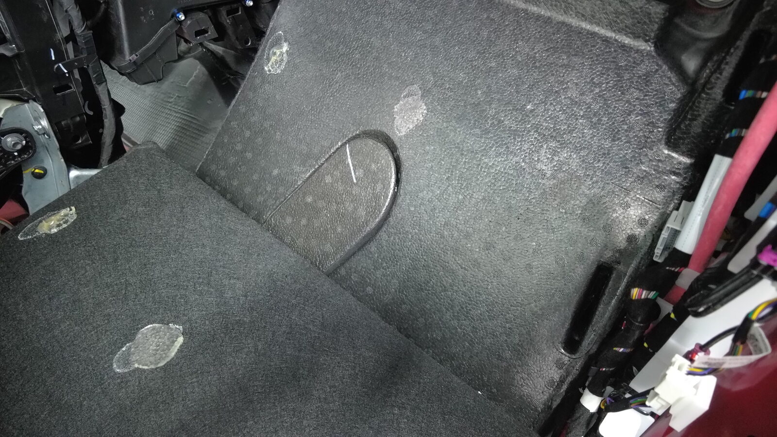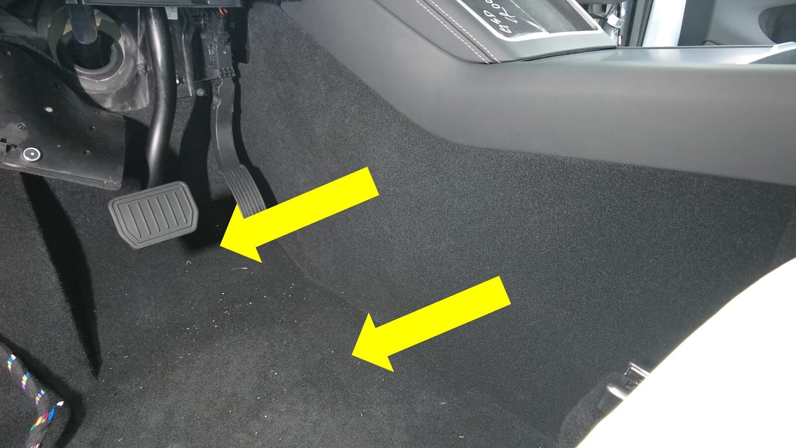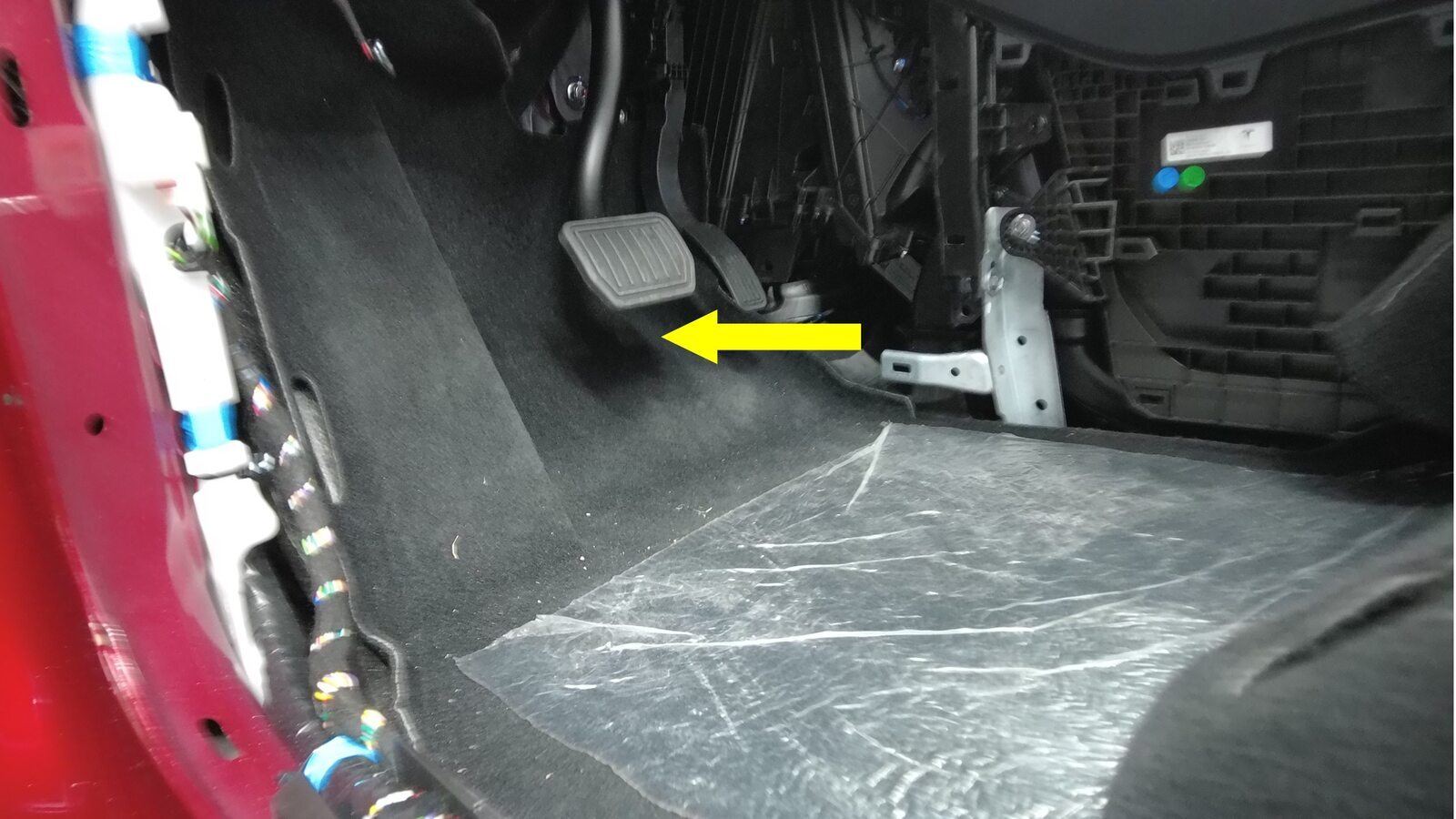 注将地毯布置在制动踏板和加速踏板下方;不同区域情况不同,有的是将地毯和泡沫粘接在一起,有的是将地毯和泡沫分离。