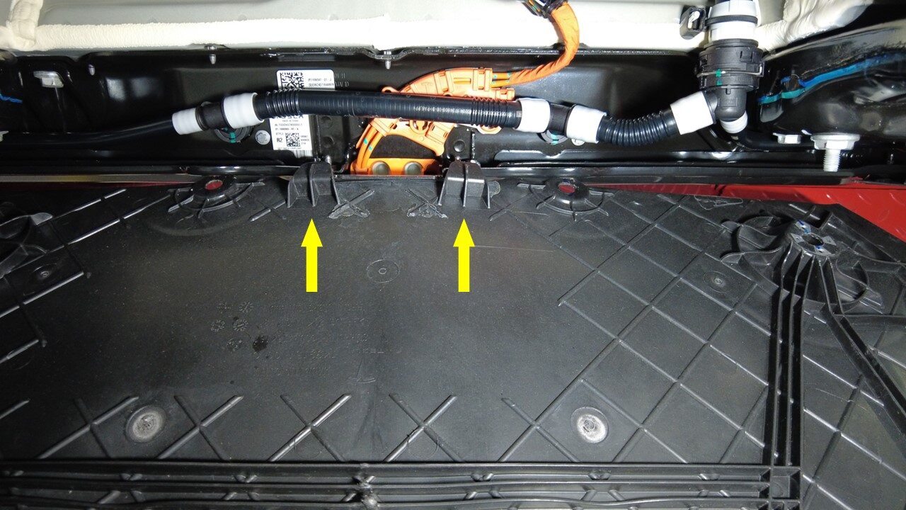 注16 个饰板夹,3 个定位销,2 个卡子;更换任何缺失或损坏的卡子;确保烟火前备箱盖传动装置与挡板上的开口对齐