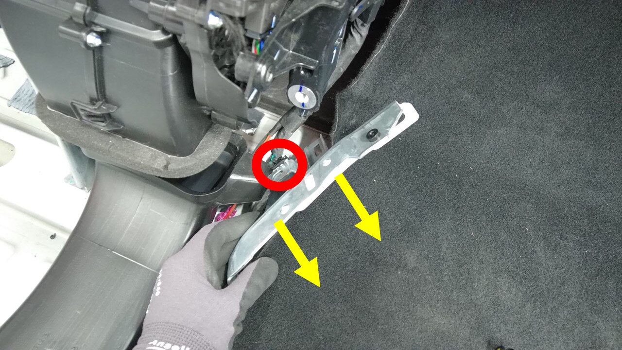 拆下用于固定仪表板右侧立板支架的螺栓和螺母,然后松开线束夹,将立板支架从车辆上拆下。