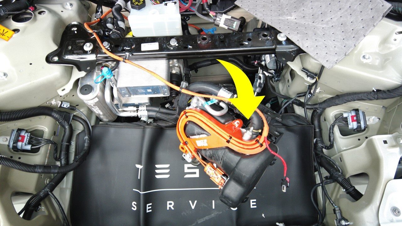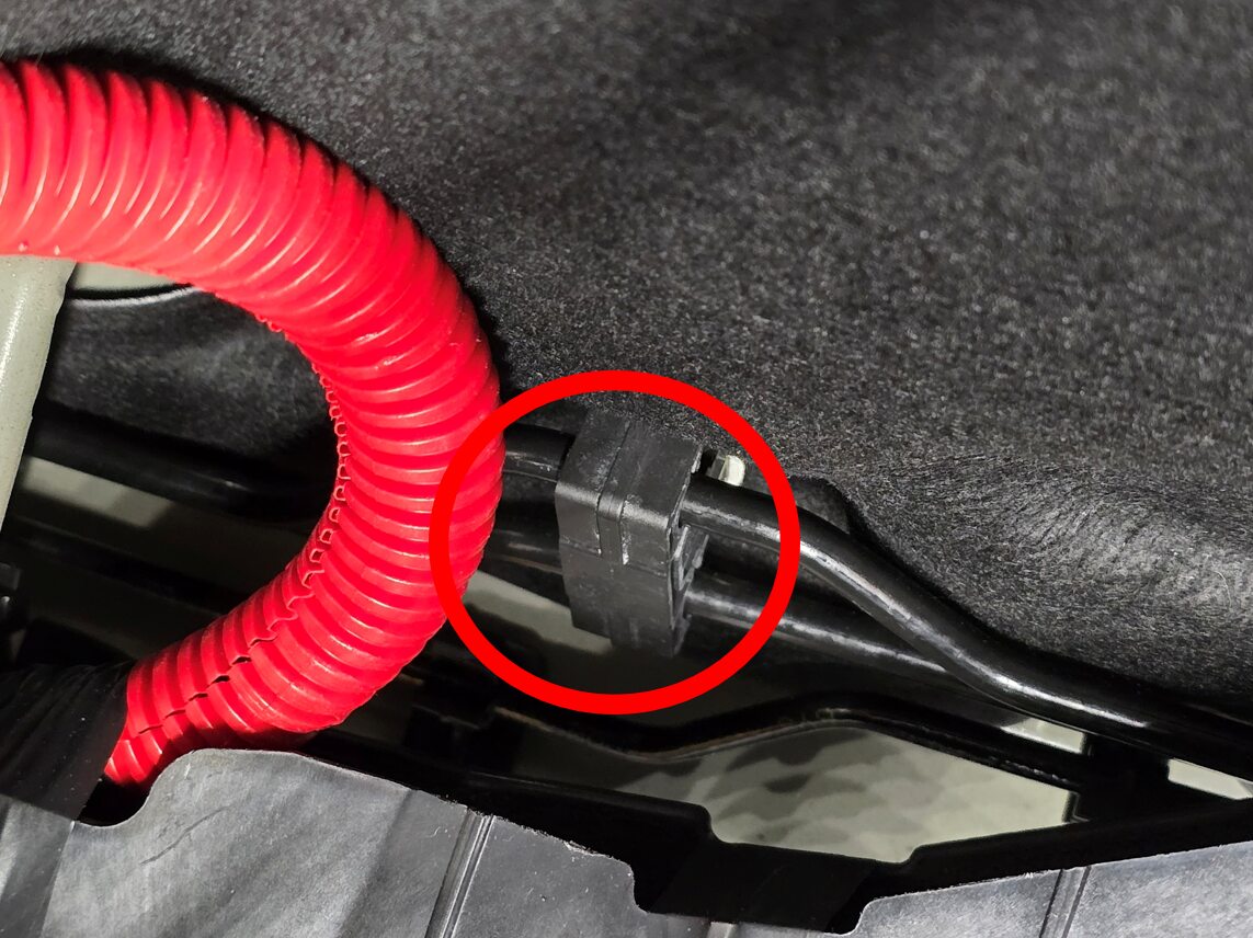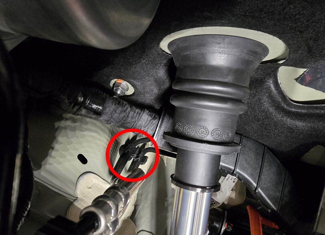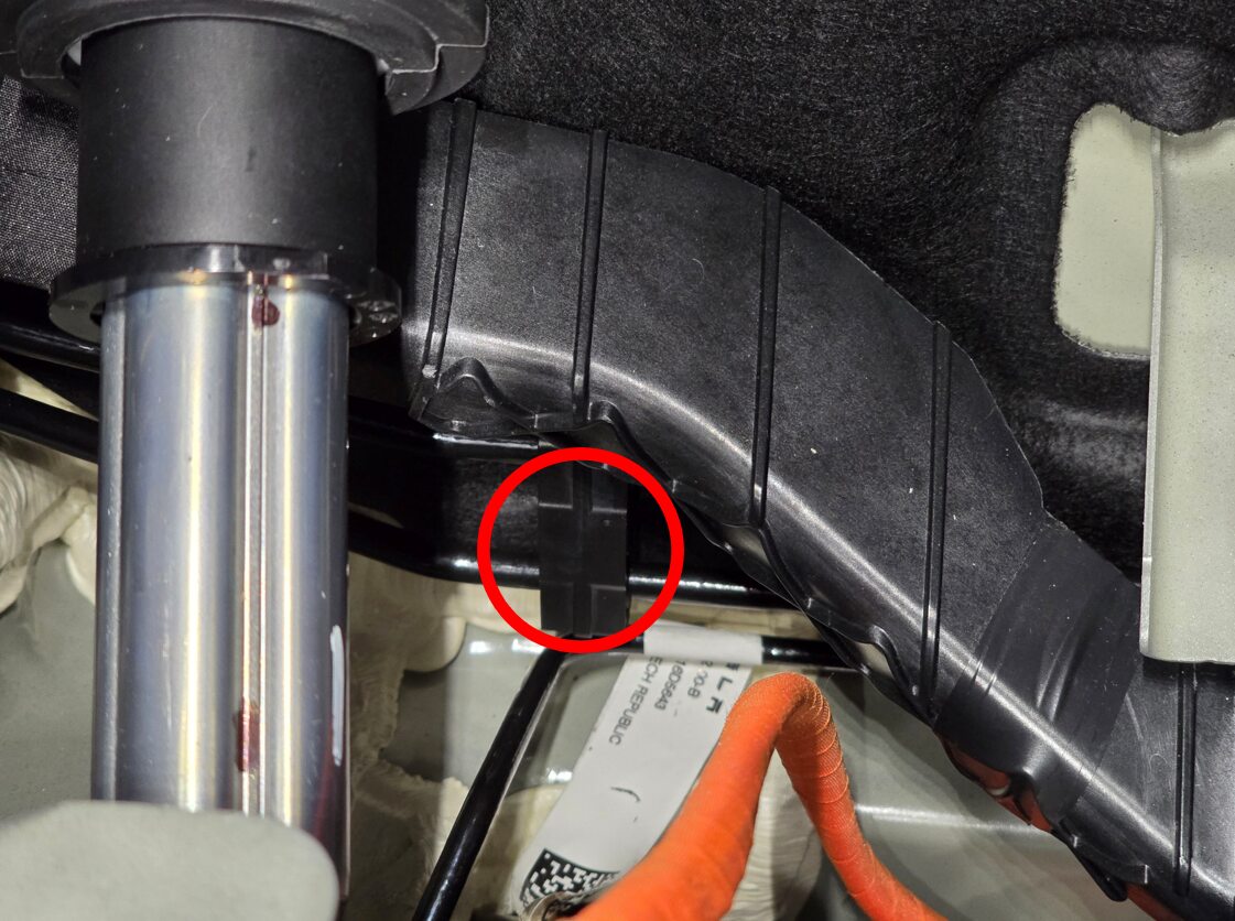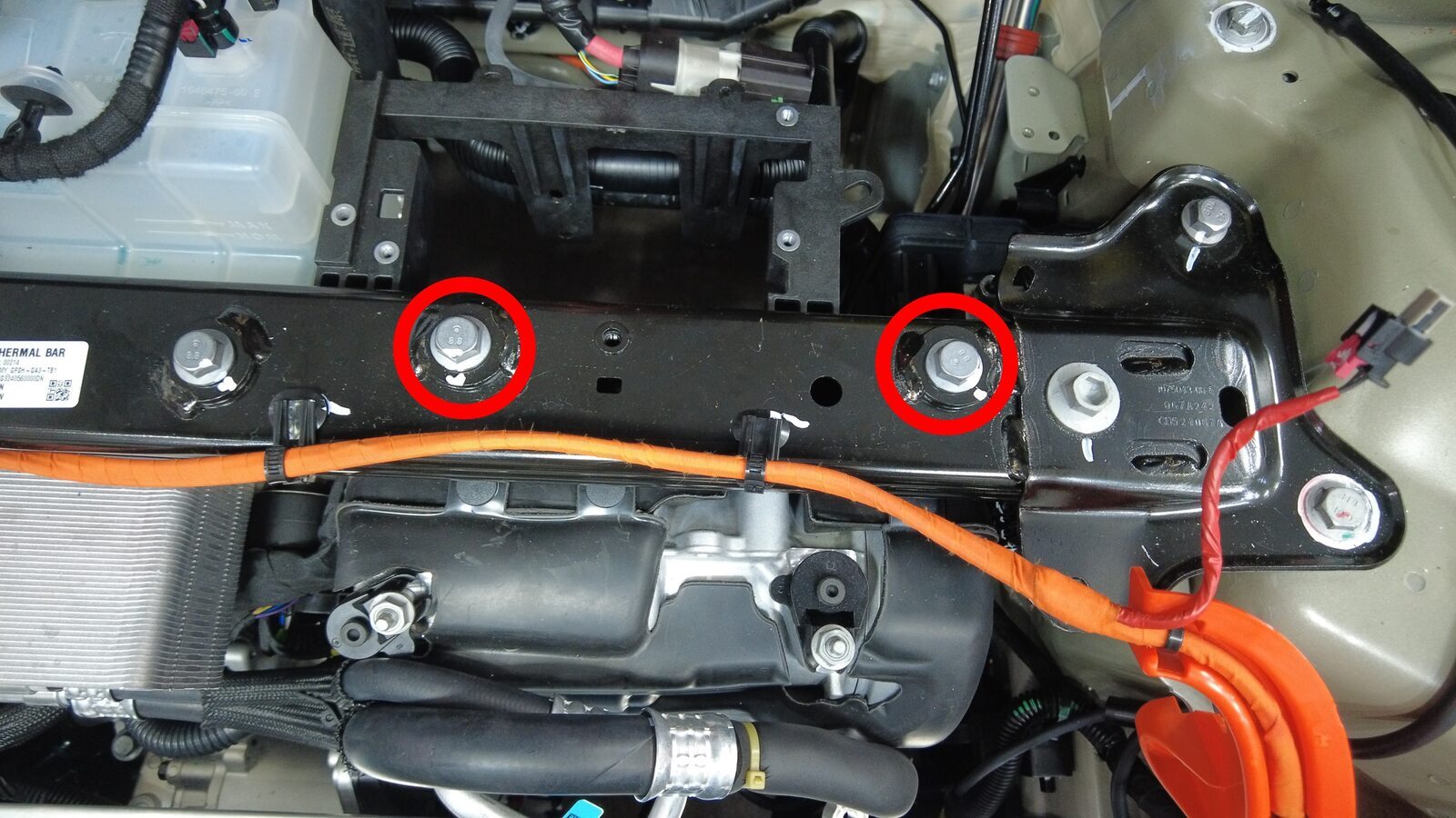 Install the retaining clips (x5) that attach the A/C compressor HV harness to the shock tower brace.