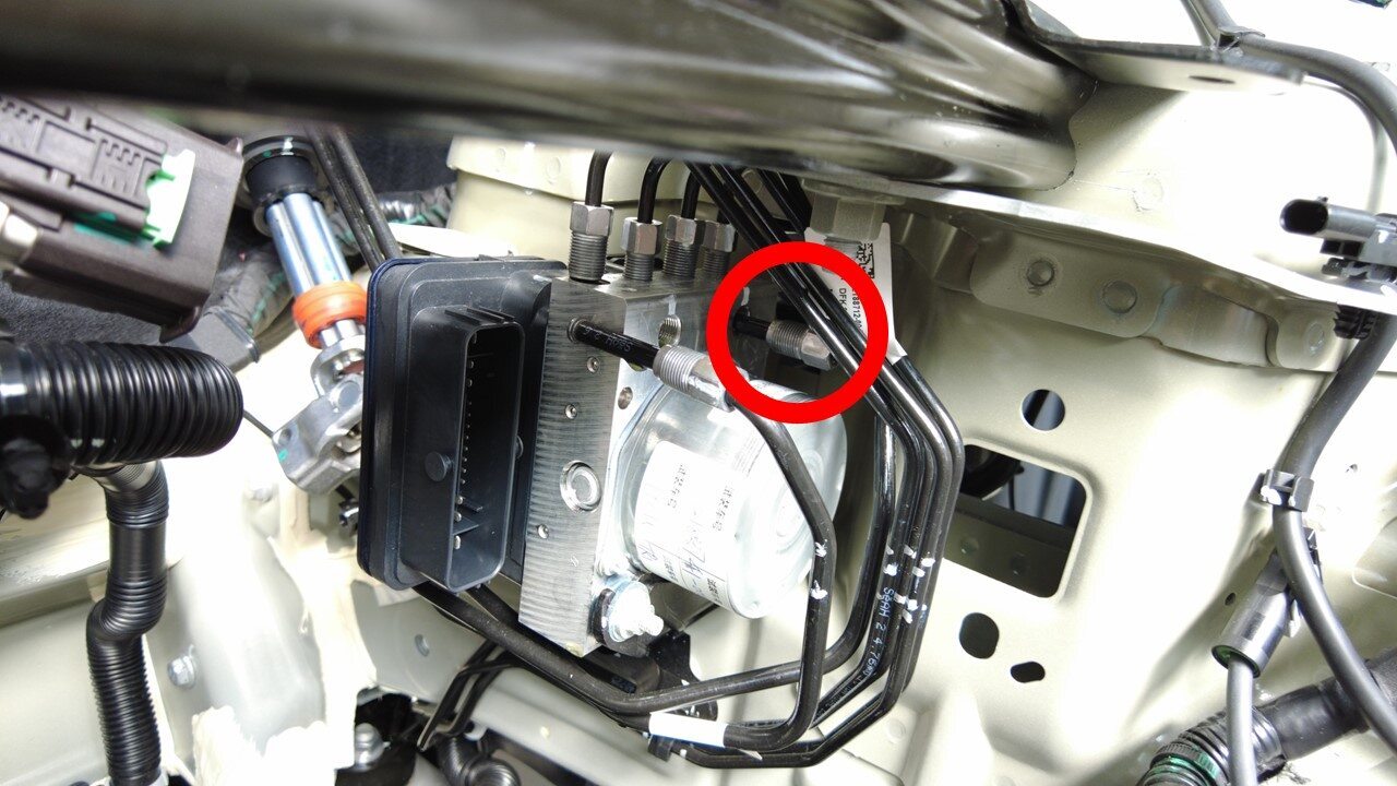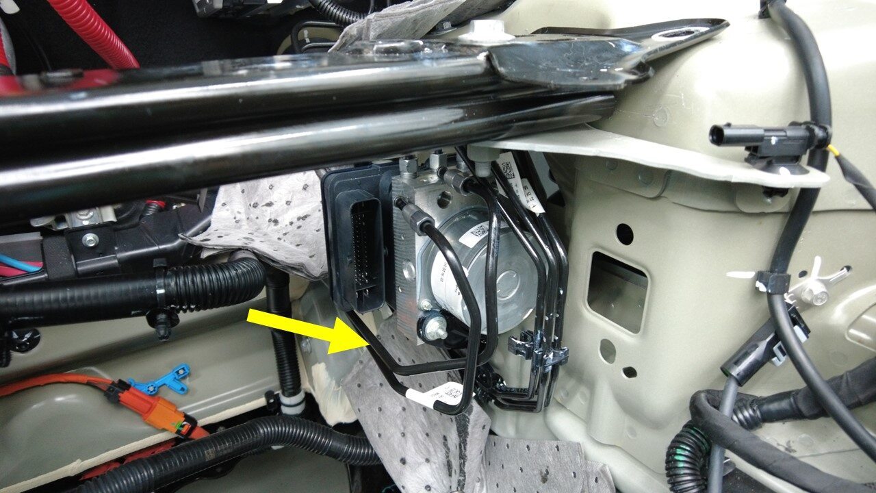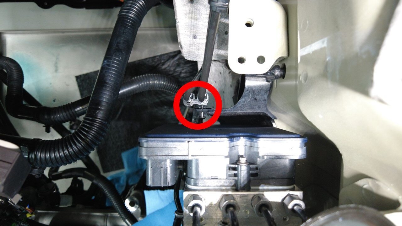 Install the clip that attaches the master cylinder brake lines to the rear of the HCU bracket.