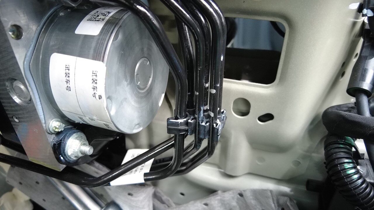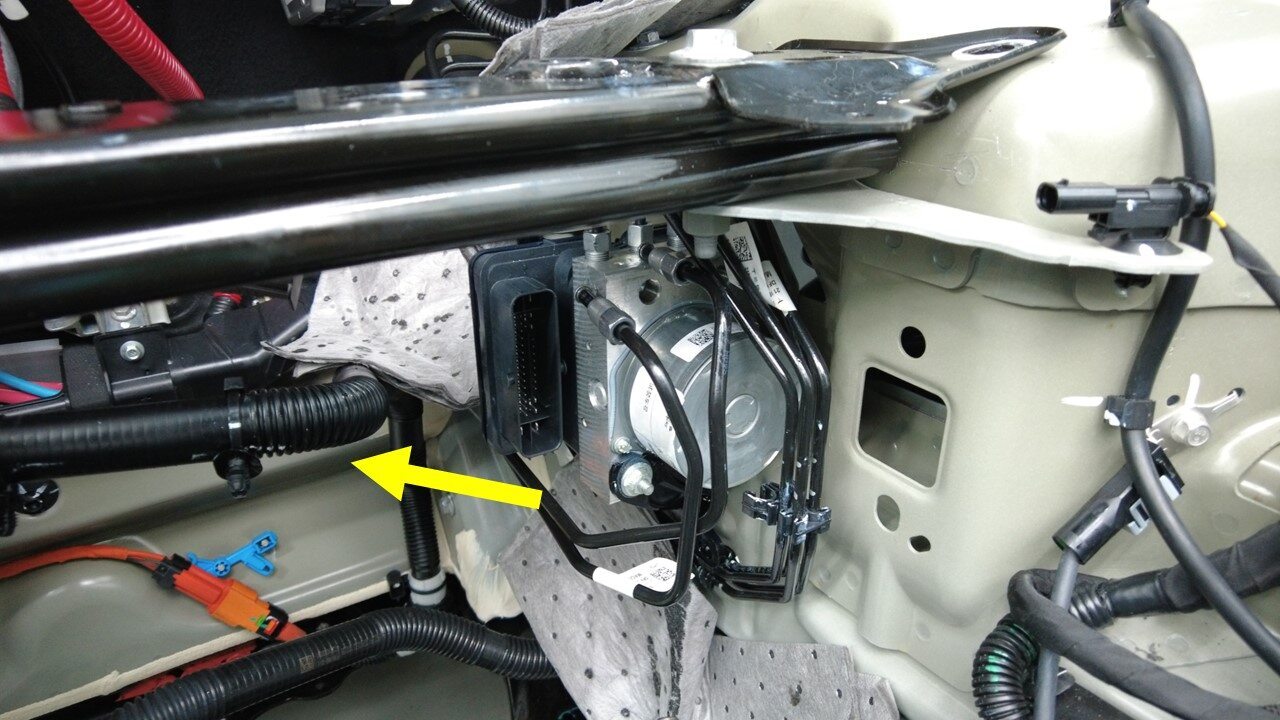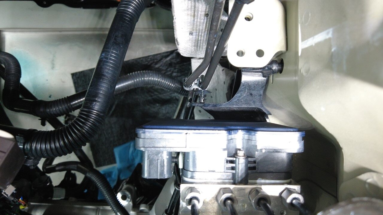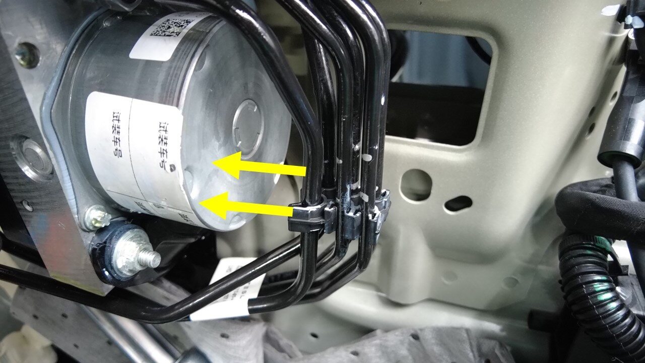 Install the clip that attaches the master cylinder brake lines to the rear of the HCU bracket.