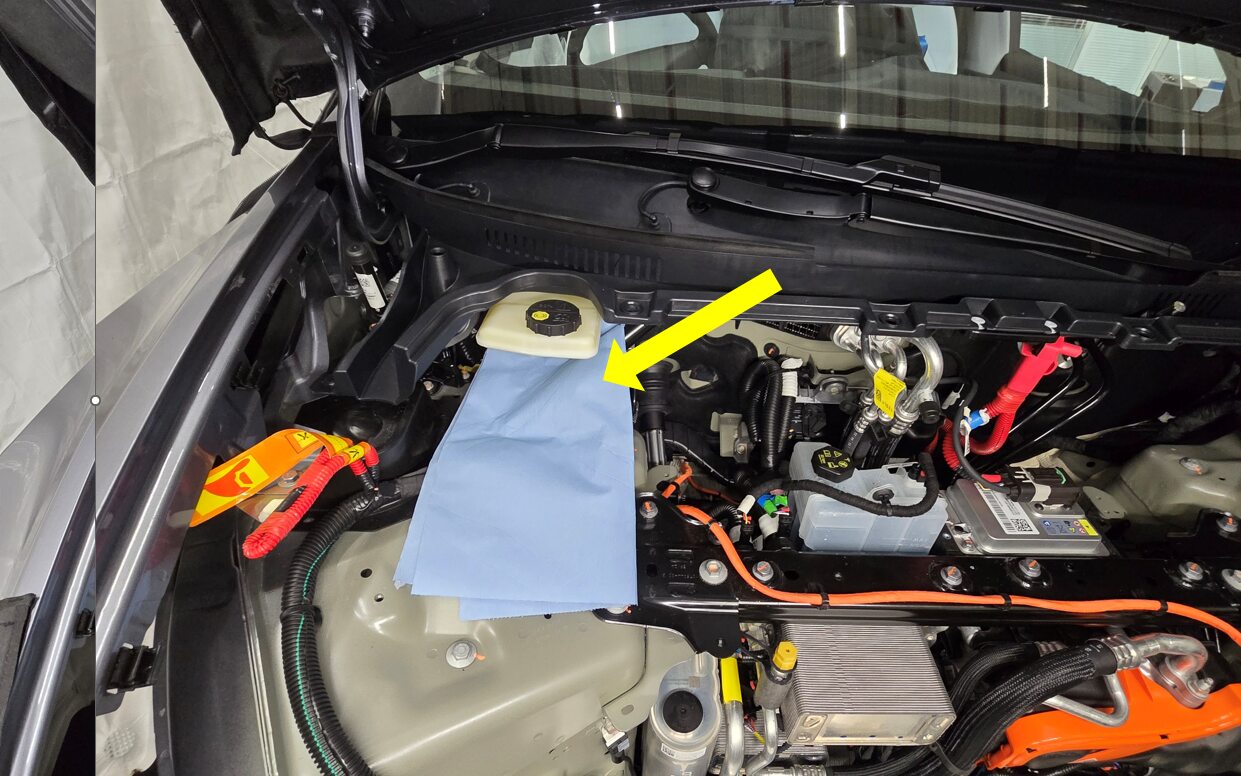- Remove the absorbent material from underneath the brake booster assembly and the reservoir area.