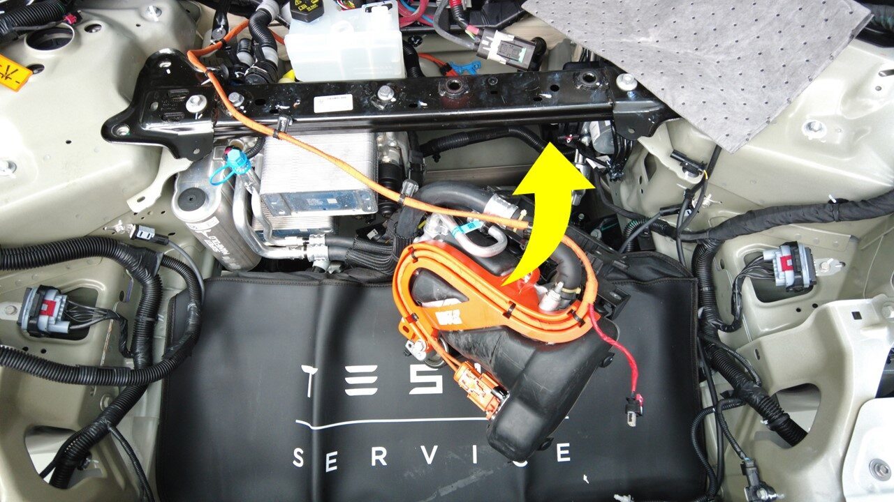 Release the retaining clips (x5) that attach the A/C compressor HV harness to the shock tower support brace.