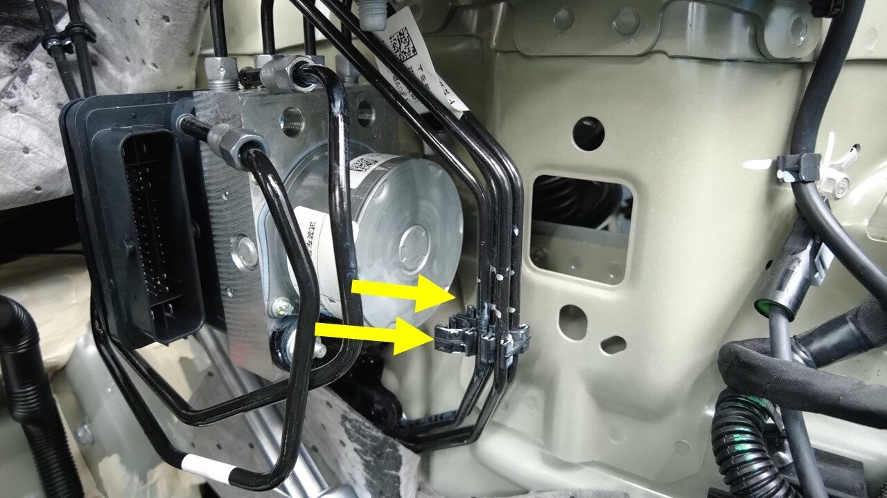 Release the clips (x3) that attach the master cylinder brake lines to the rear of the HCU bracket and body.
