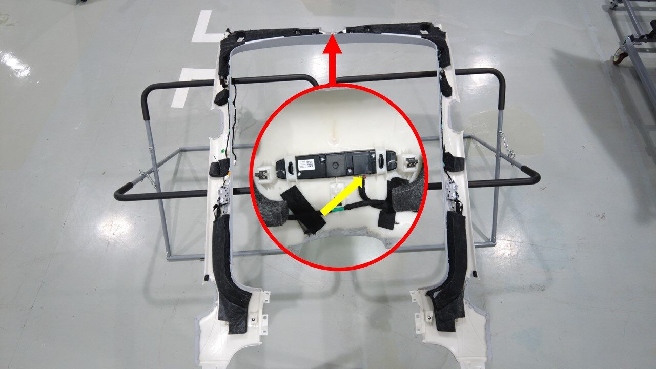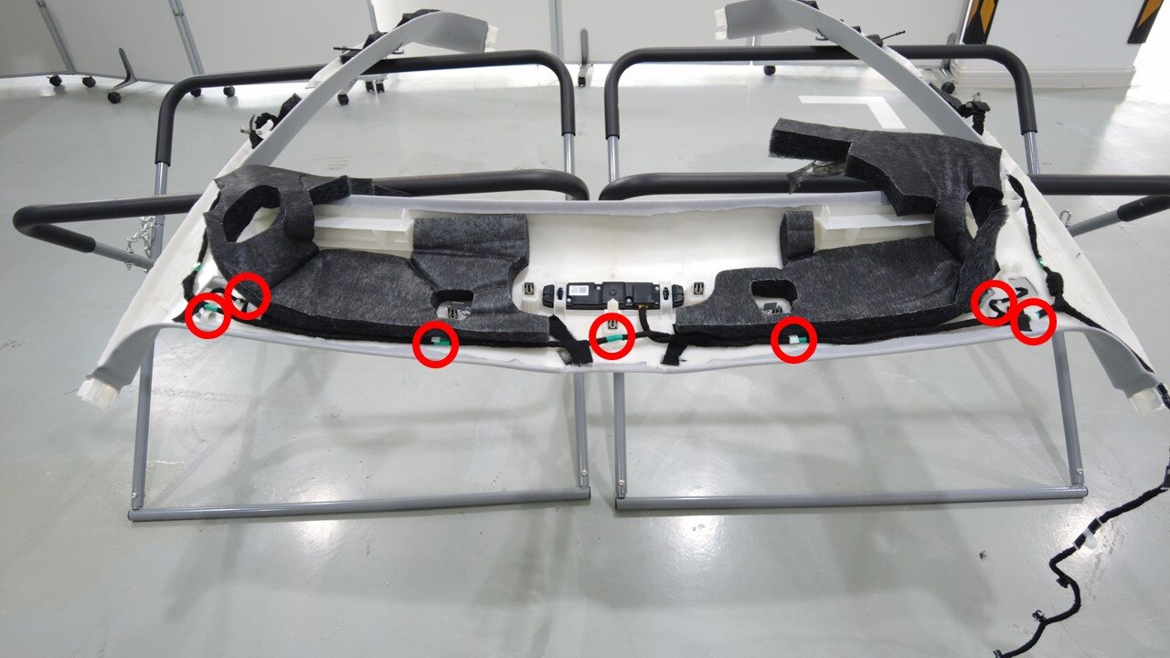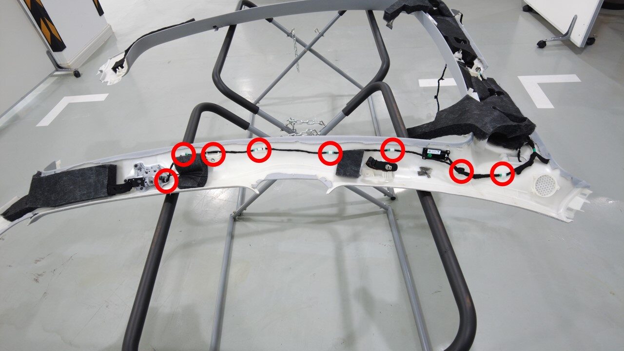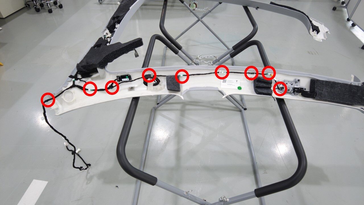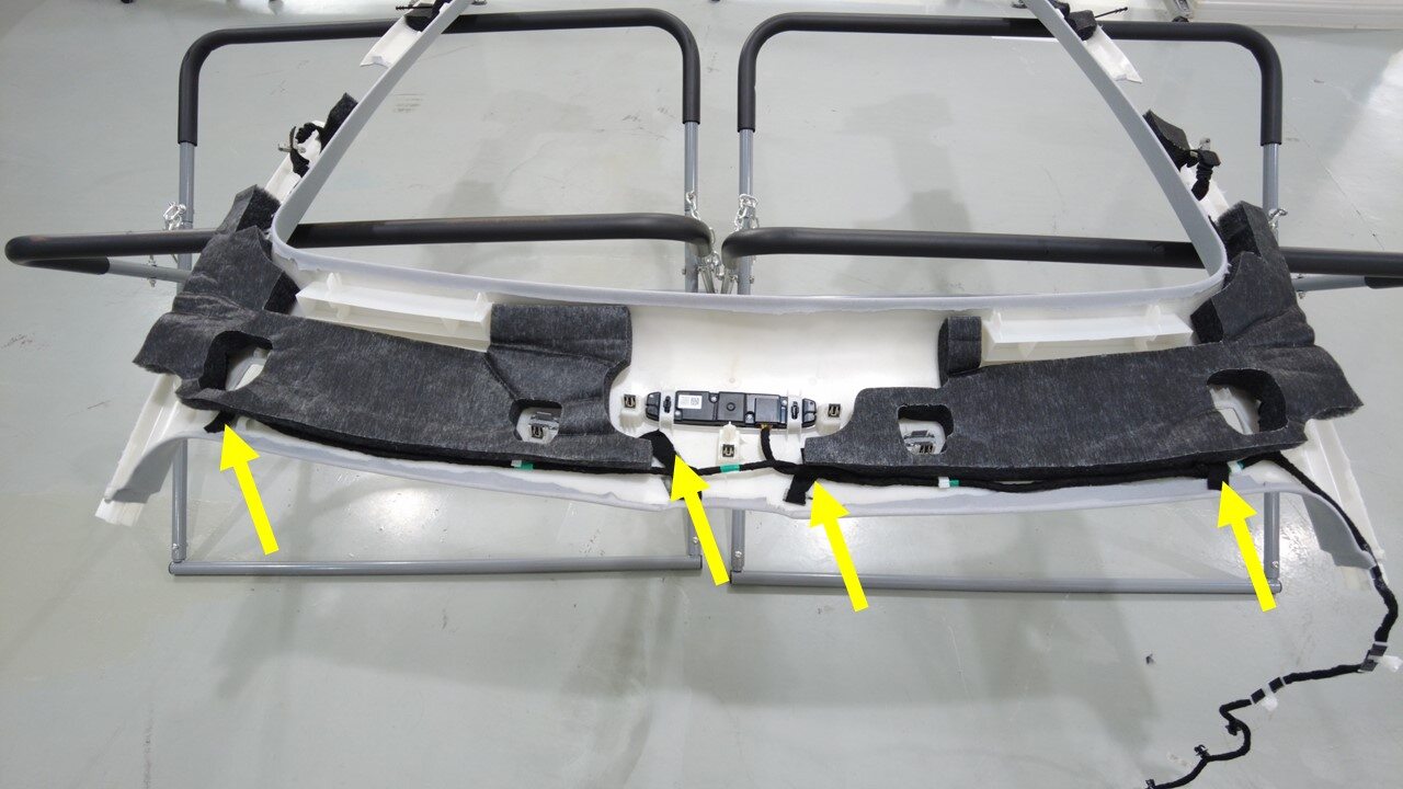 紧固树形头卡子(2 个),卡子(22 个)并粘贴胶带,将顶篷线束安装到前部顶篷上。
