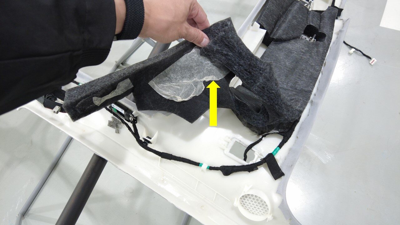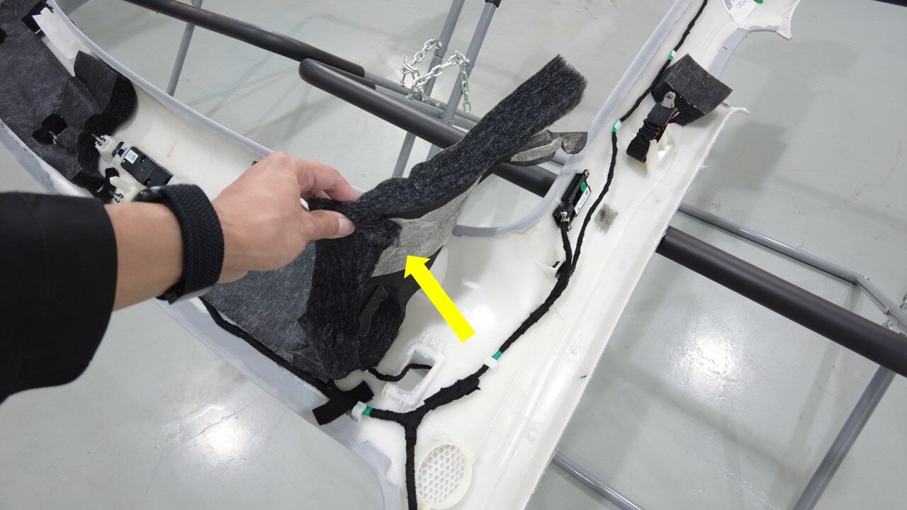 注部分提起 NVH 棉垫以松开前部顶篷线束。注意请勿损坏 NVH 棉垫。