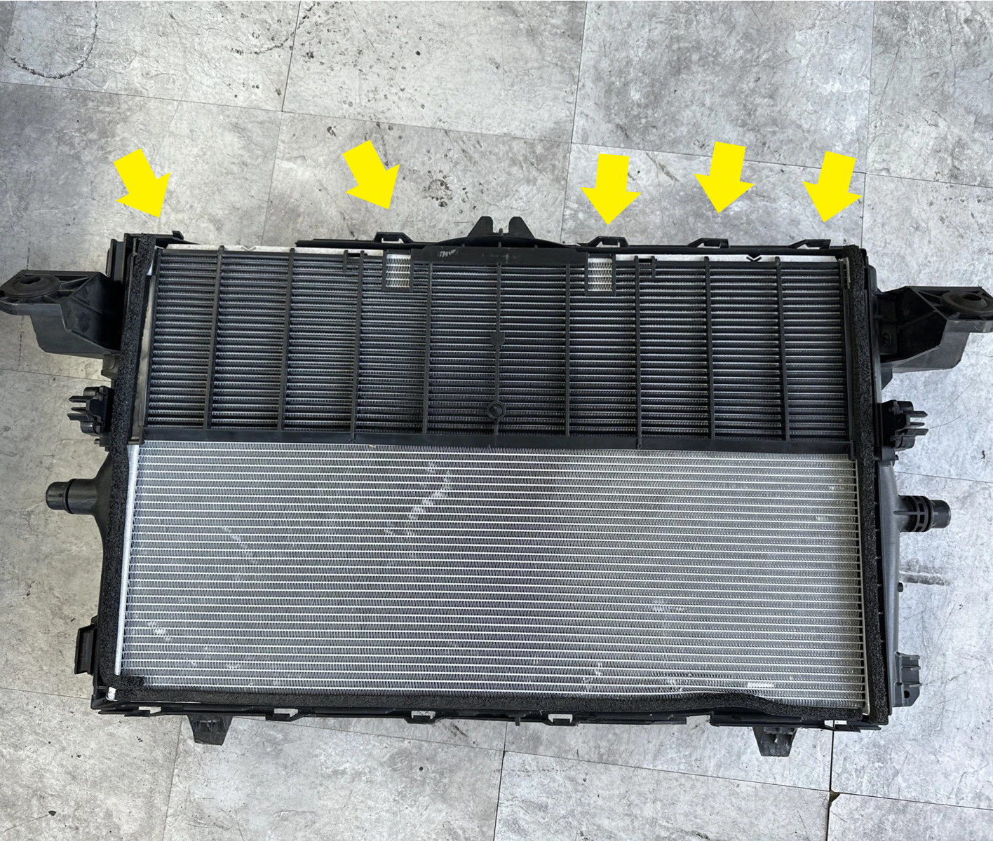 松开将散热器固定到风扇和护罩总成的锁片,然后将散热器从固定支座中滑出。