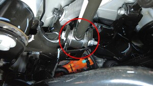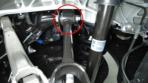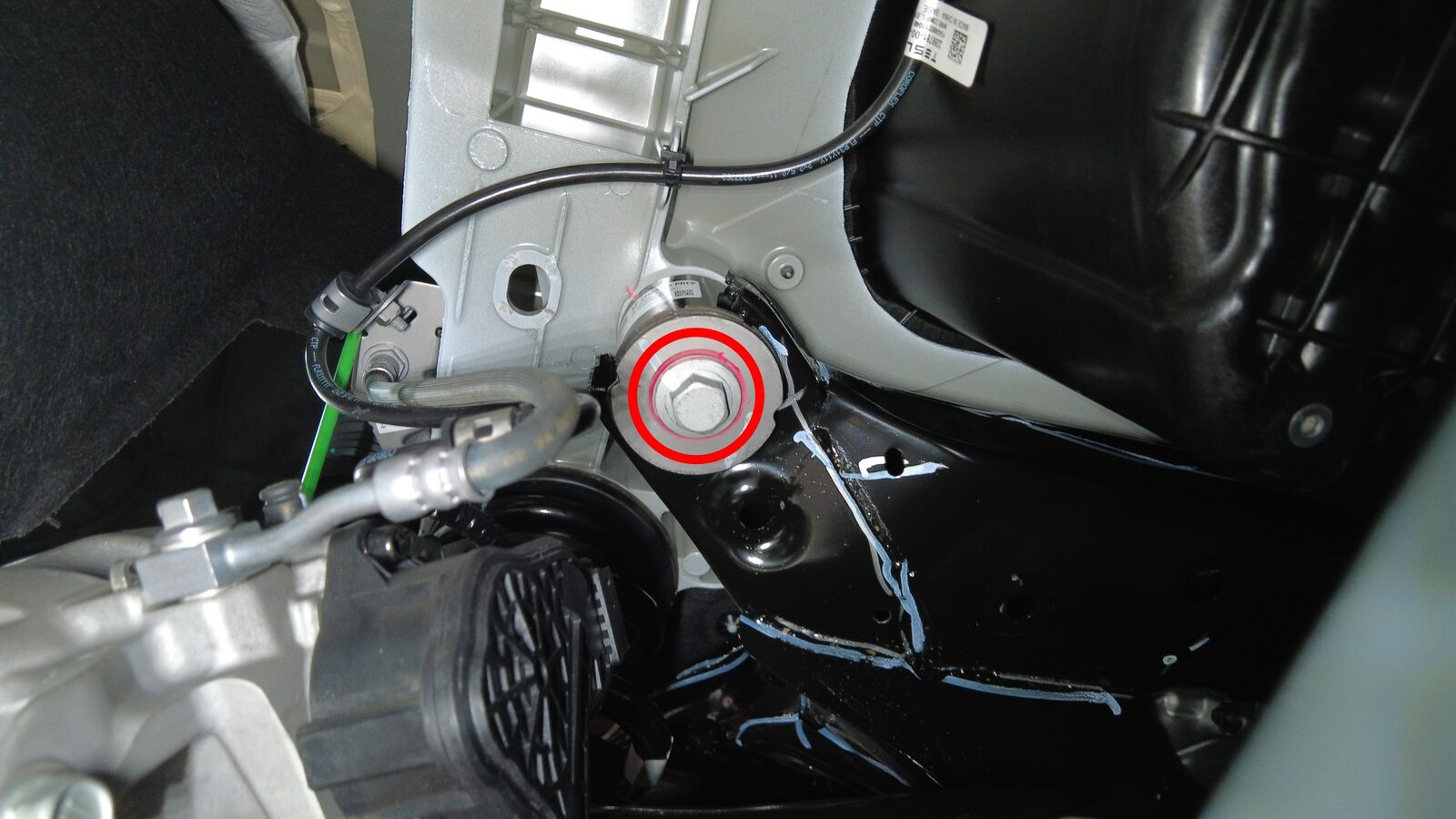 检查将左侧剪力板和副车架固定到车身的大号螺栓,确认其扭矩,然后用油性记号笔标记螺栓。