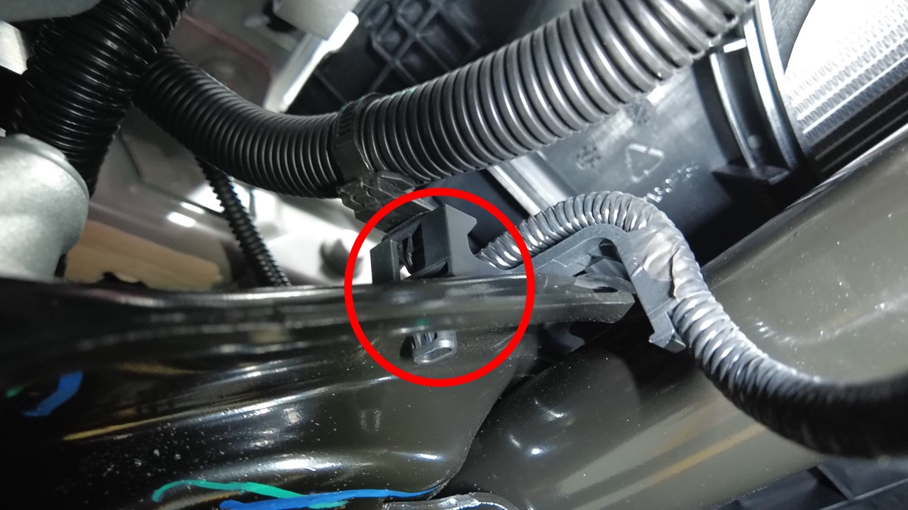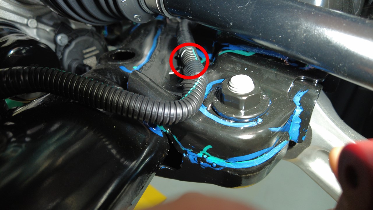 将前驱动单元线束夹紧固到前副车架左侧。
