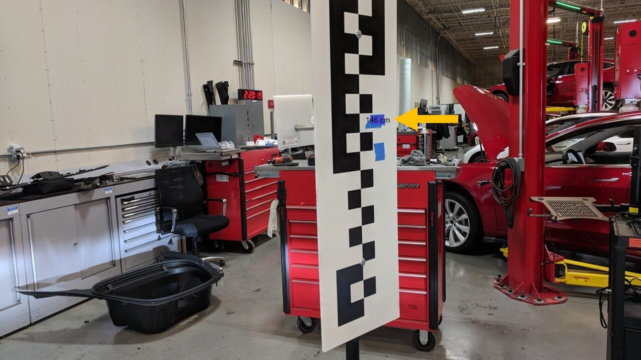 警告请勿根据过往的验证使用现有的标记。揭下任何现有的胶带。测量并重新粘贴新胶带,以确保胶带处于正确的位置。注目标上的棋盘格图案用于配备第一代 Autopilot 自动辅助驾驶的车辆。粘贴胶带时忽略棋盘格图案。注如果车辆配备了改变车辆行驶高度的自购悬架部件,则可能需要调整胶带高度以确保倾角验证准确无误。