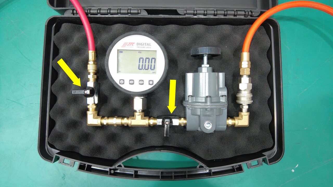 关闭右侧调压器阀门,记录显示的起始压力,然后启动 40 秒计时器。