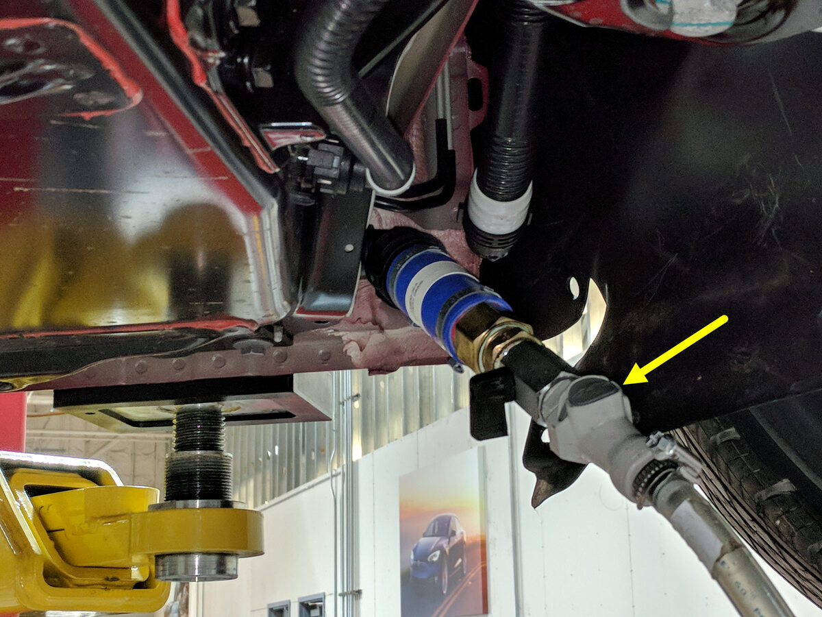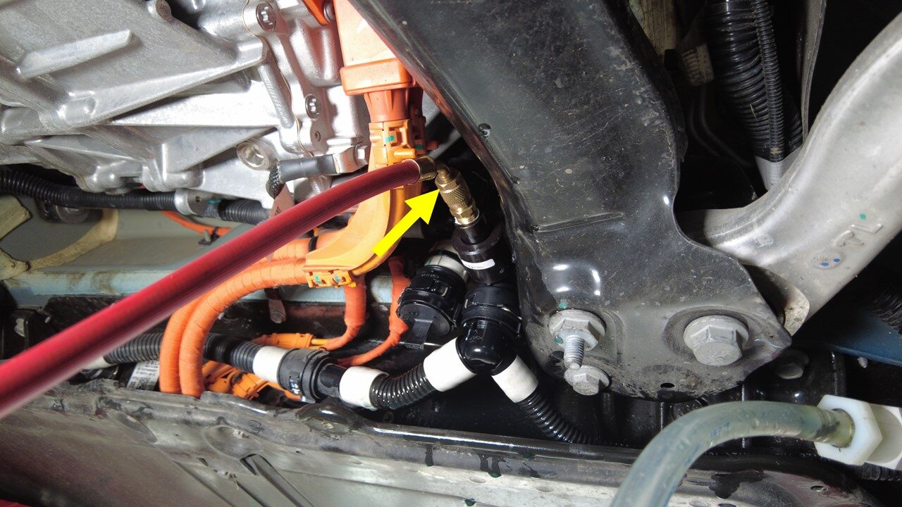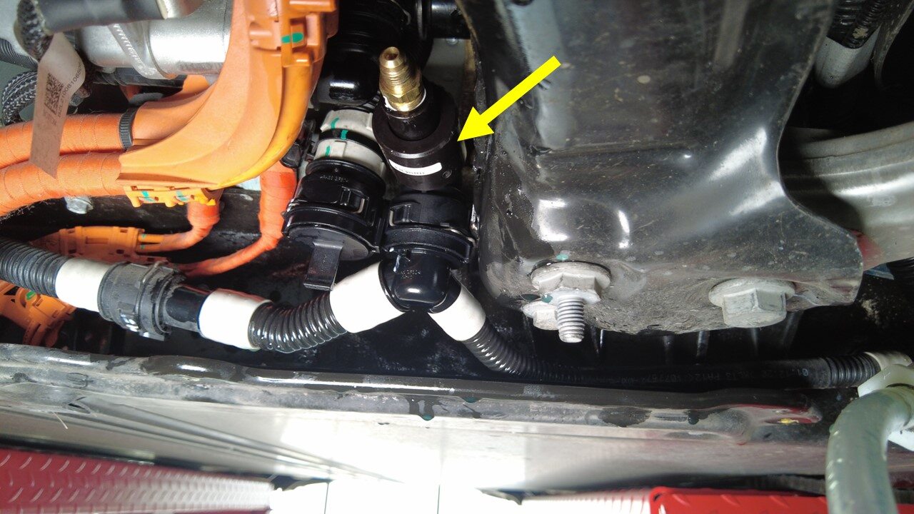 将冷却液压力测试仪从高压电池前歧管软管上断开,如有必要,请堵住冷却液连接处。