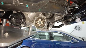 稍稍降低前驱动单元,然后向后向下撬动前驱动单元,使其从副车架上脱离。