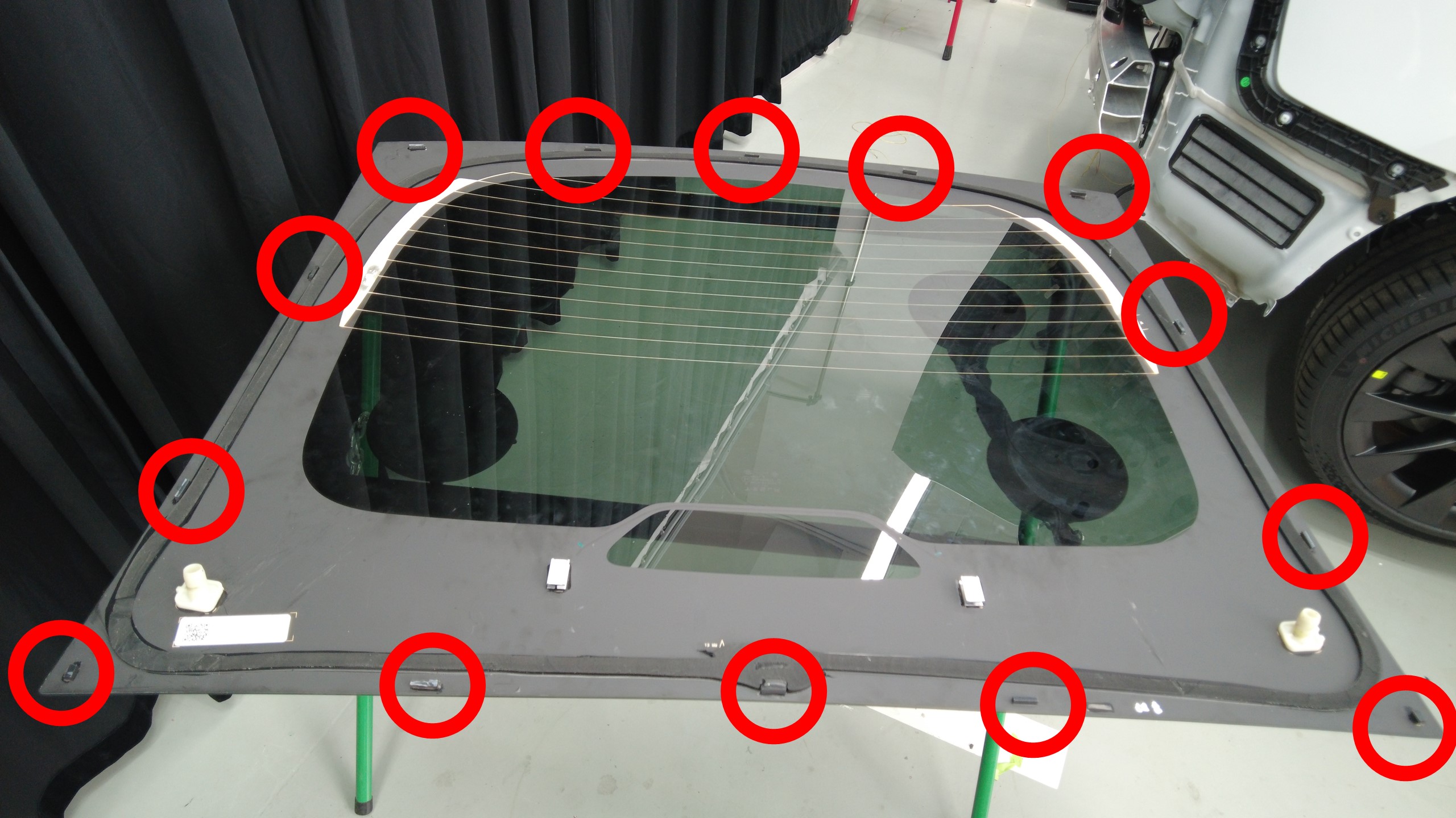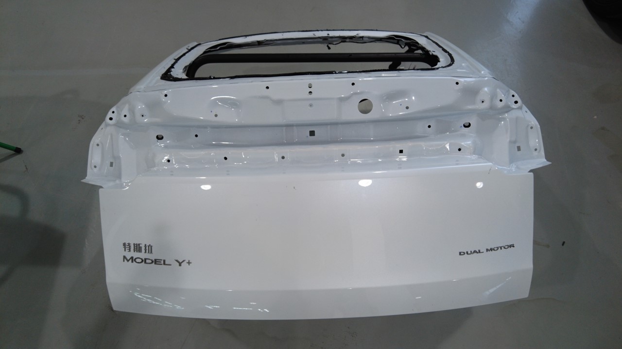 - 在协助下,将新的掀背尾门放置在支撑架上。