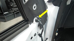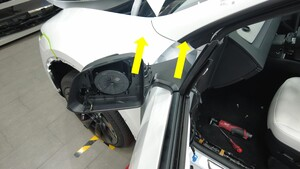 将后视镜线束穿过车门开口,然后将左前外后视镜总成放置在左前车门上。
