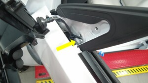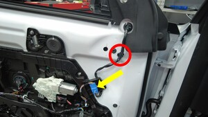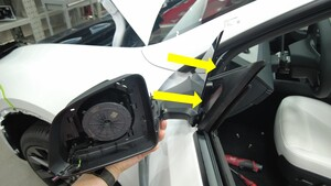 推动索环穿过左前车门,向上移动后视镜总成,同时将后视镜线束穿过,从而将左前后视镜总成从左前车门上彻底拆下。