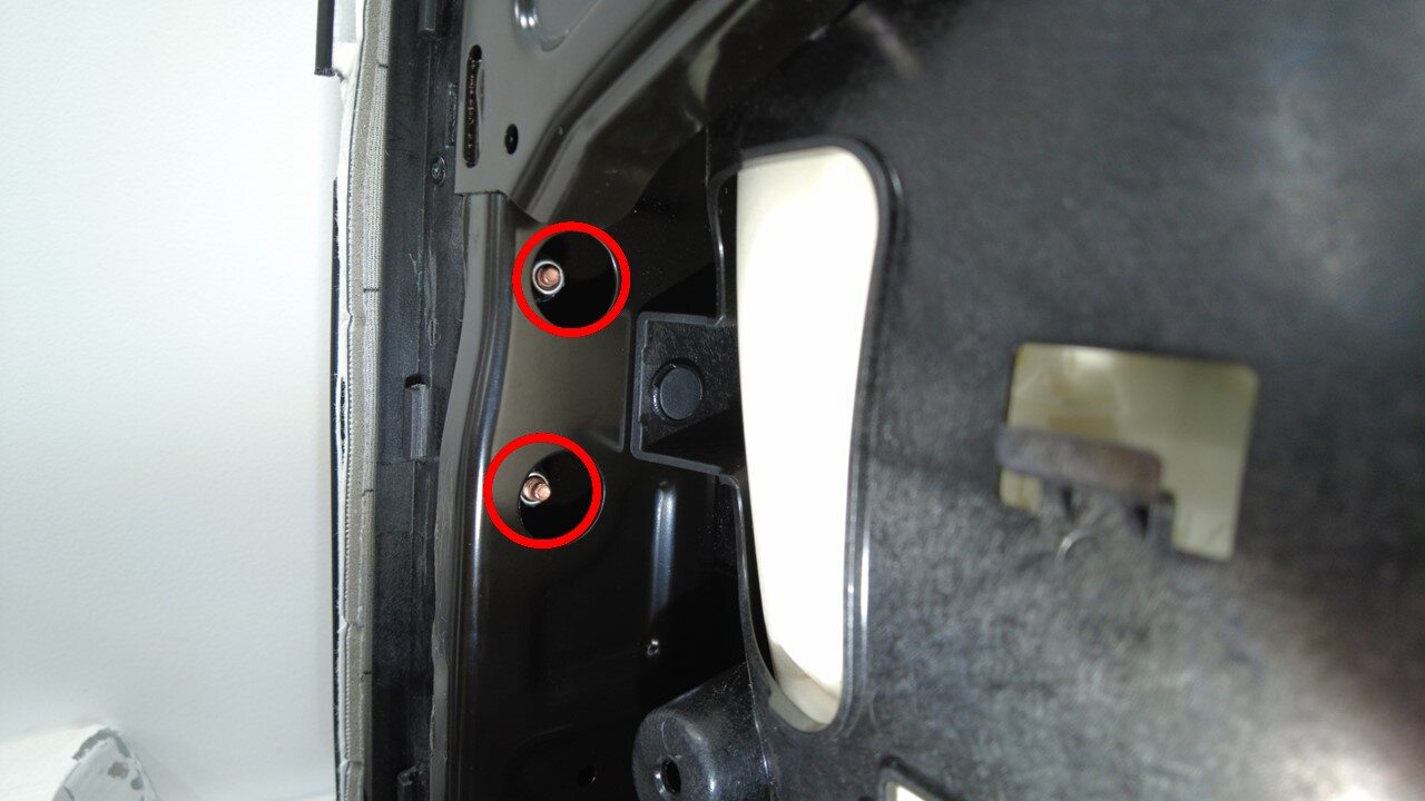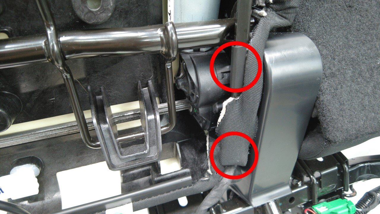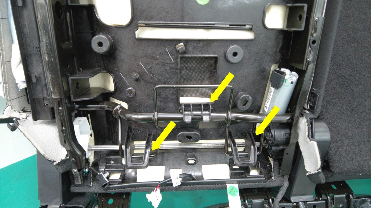 将第三排左侧座椅靠背右侧饰板固定件(2 个)安装到座椅靠背框架上。