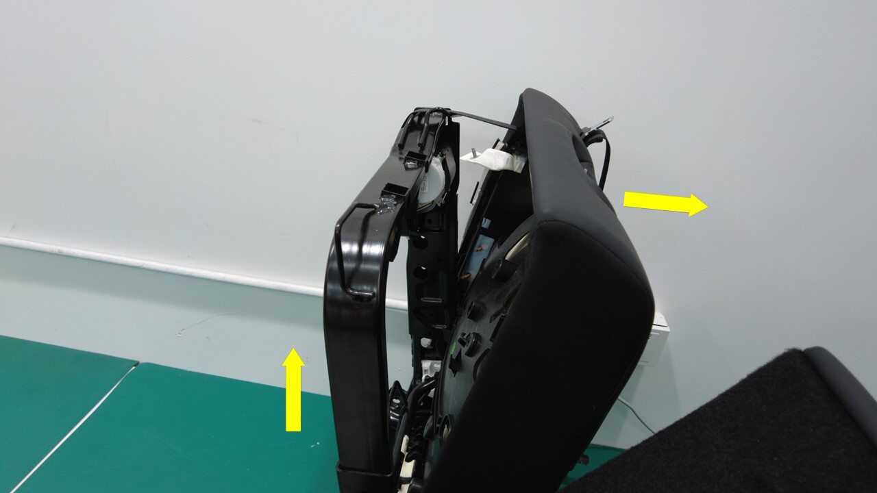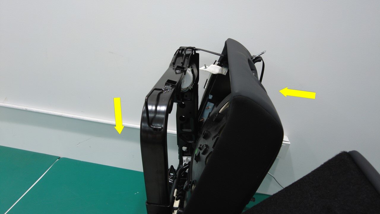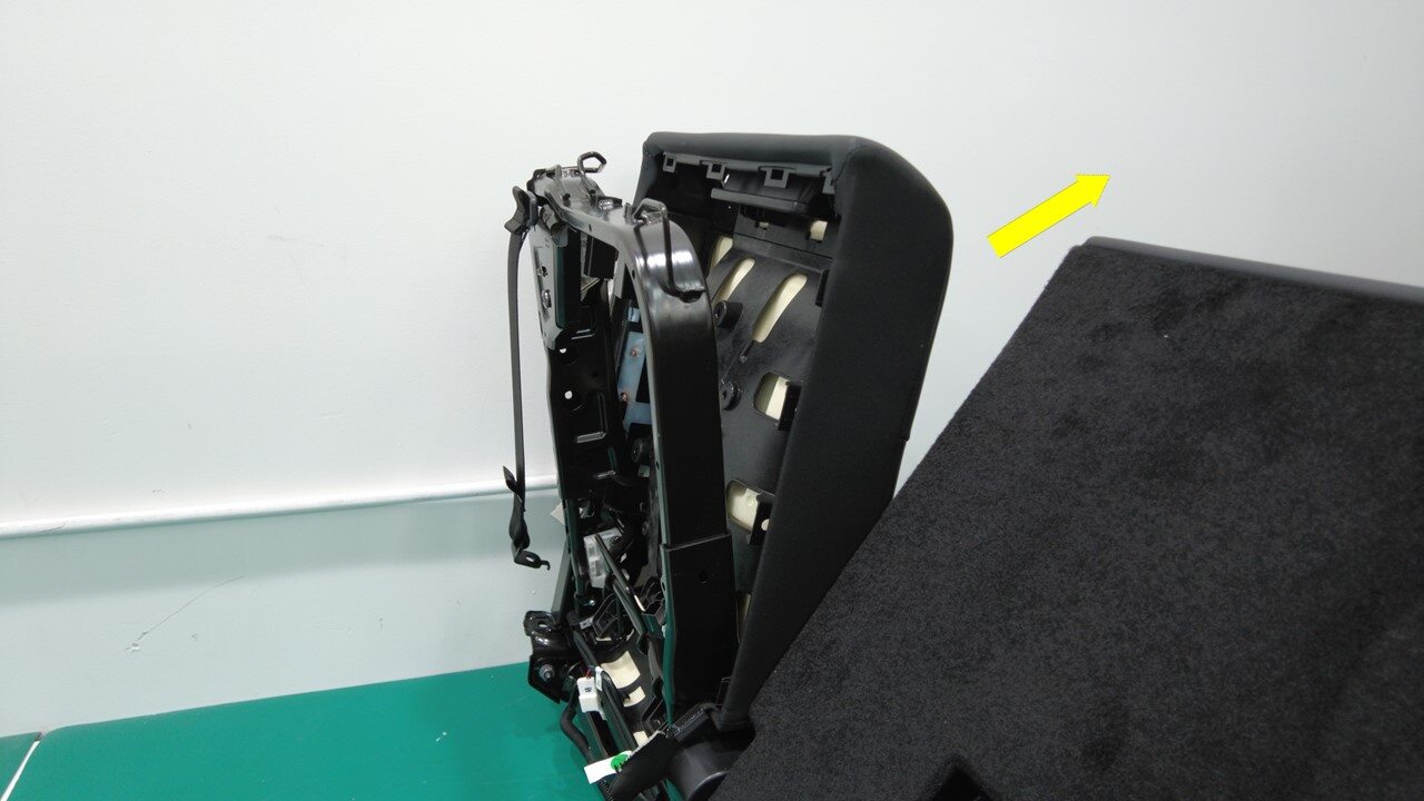 在协助下,将第三排座椅靠背总成放置到有垫层的表面。