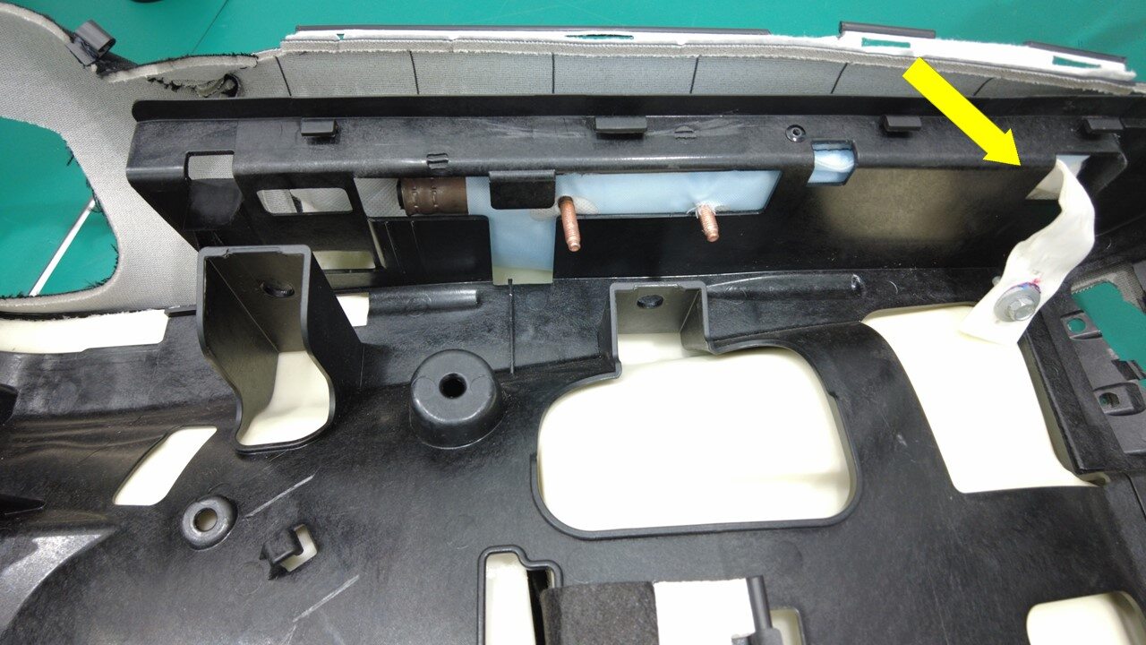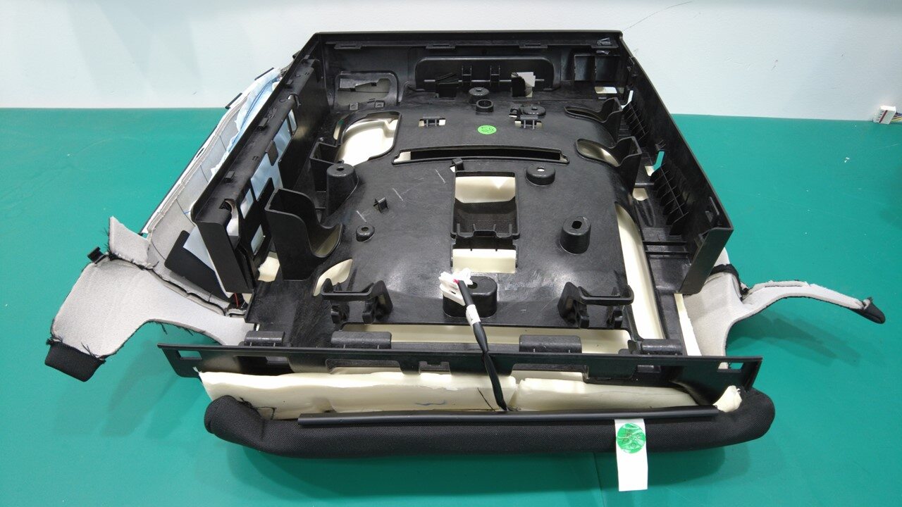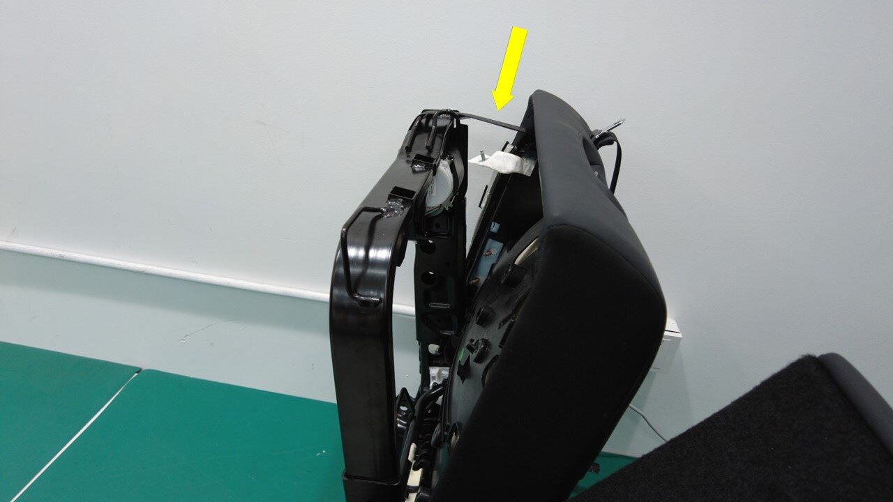 将第三排左侧座椅靠背外壳放置在泡沫饰板总成上,将气囊滑槽安装到外壳上,然后将线束紧固到凹槽卡子上。