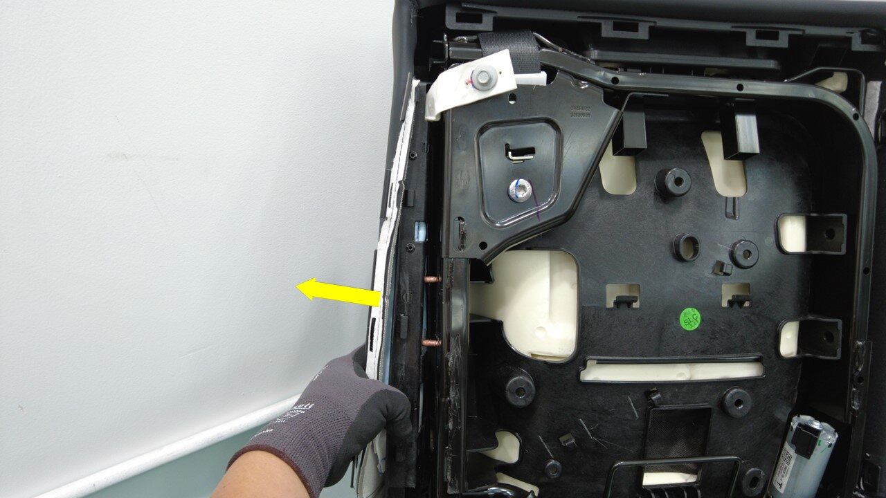 将线束从凹槽卡子上拆下,再将侧气囊滑槽从座椅靠背外壳上拆下,然后将第三排左侧座椅靠背外壳从泡沫饰板总成上拆下。