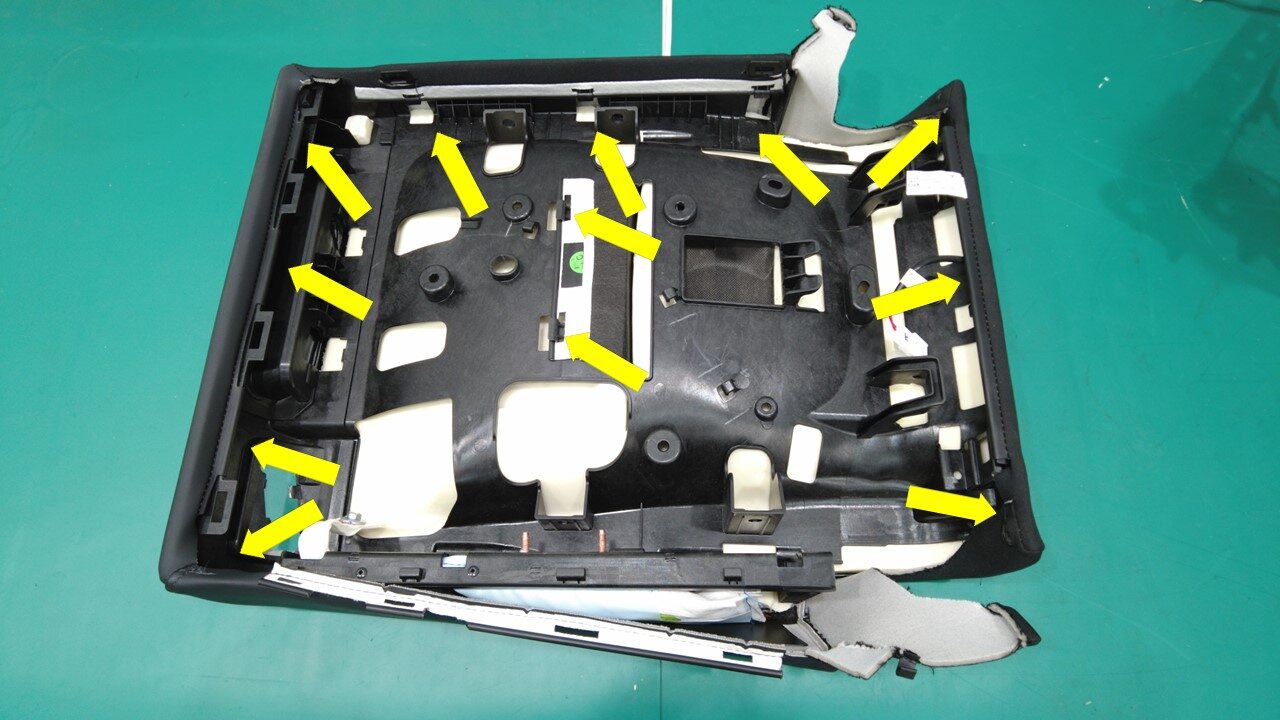 将第三排左侧座椅靠背饰板固定件(12 个)从座椅靠背外壳上松开。