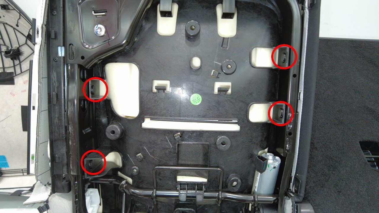 将第三排左侧座椅靠背饰板固定件(5 个)紧固到座椅靠背框架上。