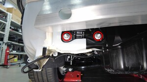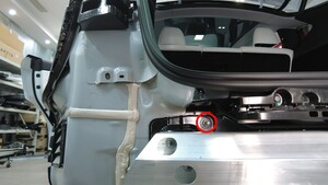 将后保险杠梁放置在车身上,然后安装将后保险杠梁固定到车辆的螺母(6 个)。