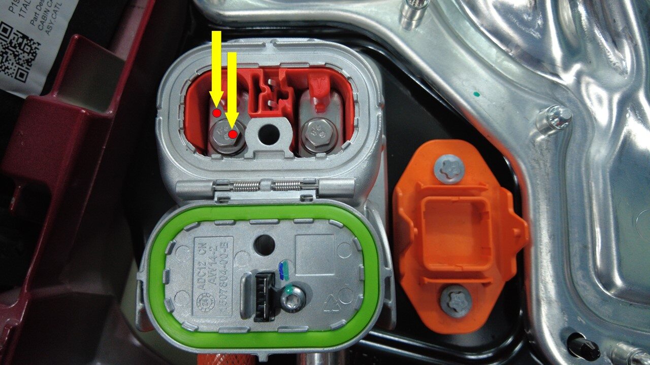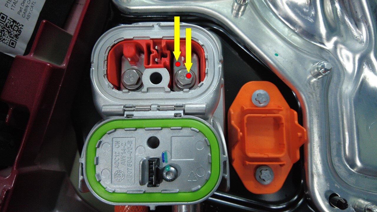 注2x HV joints, The acceptable resistance is between 0.050 mΩ (50 μΩ) and 0.195 mΩ (195 μΩ). If the resistance is greater than 0.195 mΩ (195 μΩ), stop work and escalate the Toolbox session. If the resistance is lower than 0.050 mΩ (50 μΩ), reposition the probes and measure again. If the resistance is repeatedly between 0.00 mΩ and 0.050 mΩ (50 μΩ), Hioki test passed, proceed to next step