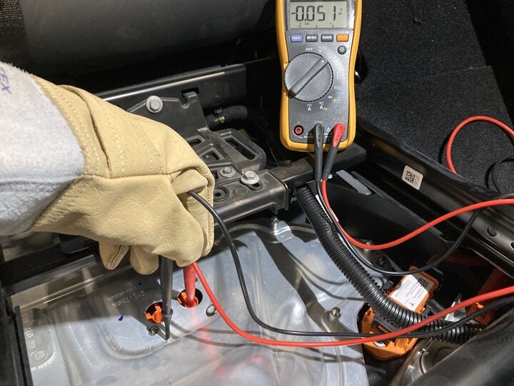 注Make sure to wear PPE (HV gloves, Safety glasses) when working on high voltage component, Measure B+ to Ground, B- to Ground, B+ to B-, If voltage is greater than 10V, Pack contactors are not open or welded, Stop work and reach out to Service Engineering