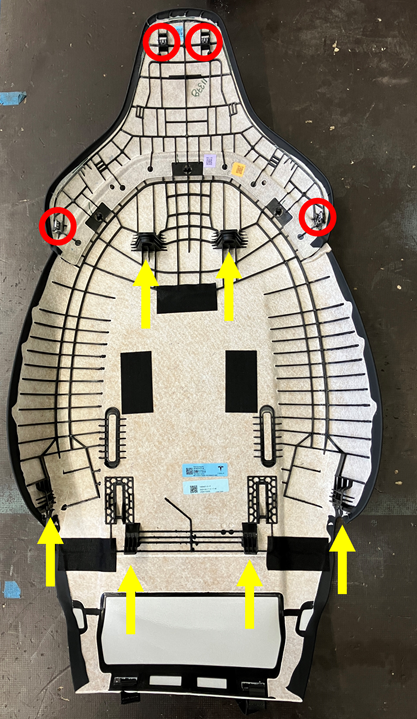 注从座椅顶部开始,将外壳拉离框架。侧面卡子都松开后,拉动底部并小心地将底部锁片从凹槽中推出。如果直接向外拉出,座椅靠背上的卡子可能会断裂。松开座椅总成下方的剩余卡子。