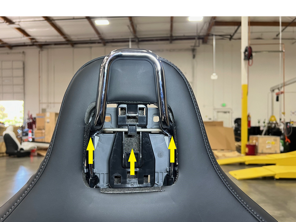 注先安装下部卡子,再将外壳向上旋转到位。轻轻拉动座椅靠背外壳以确保其已完全就位。头枕柱安装好后会与座椅靠背接合。