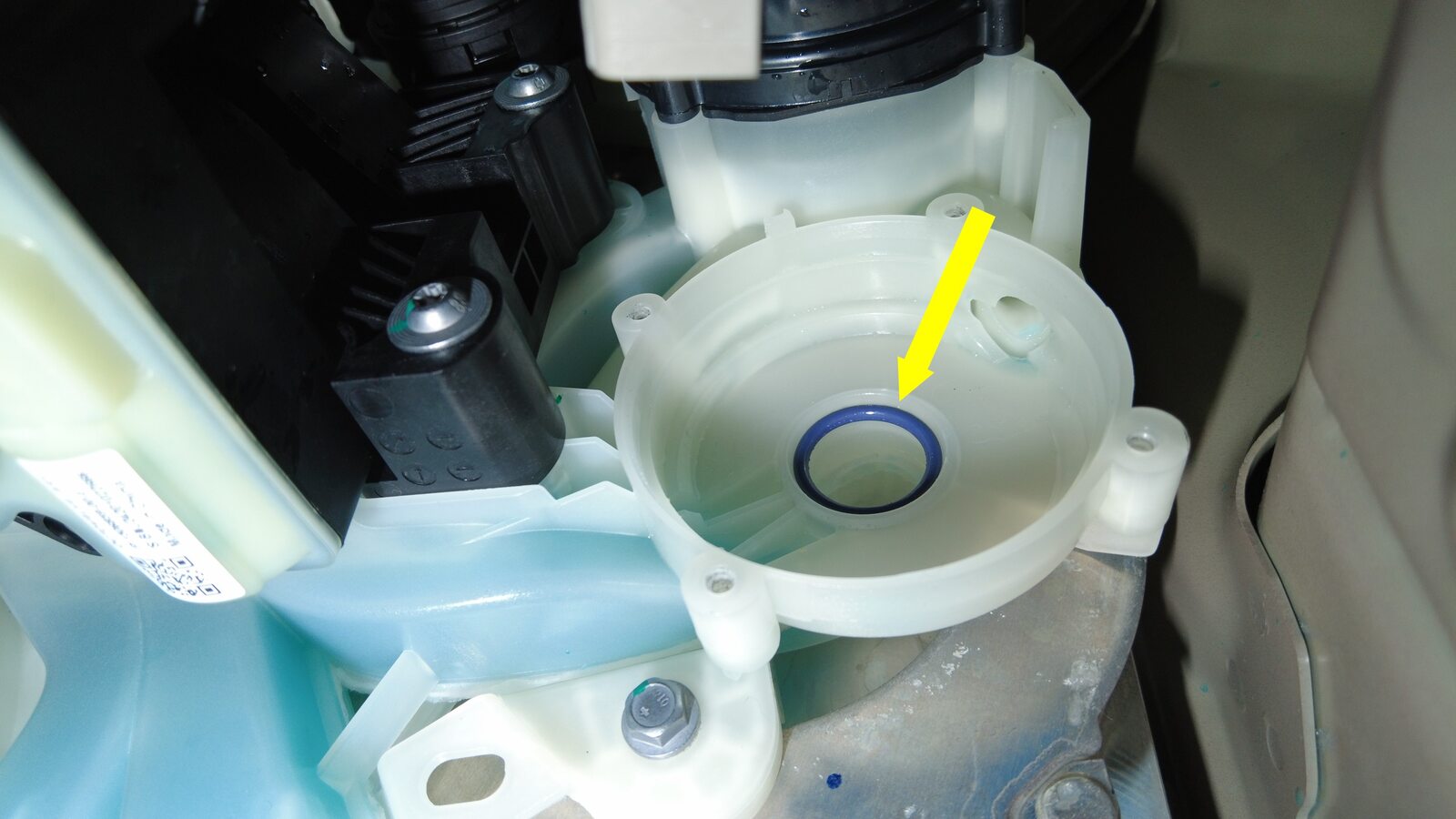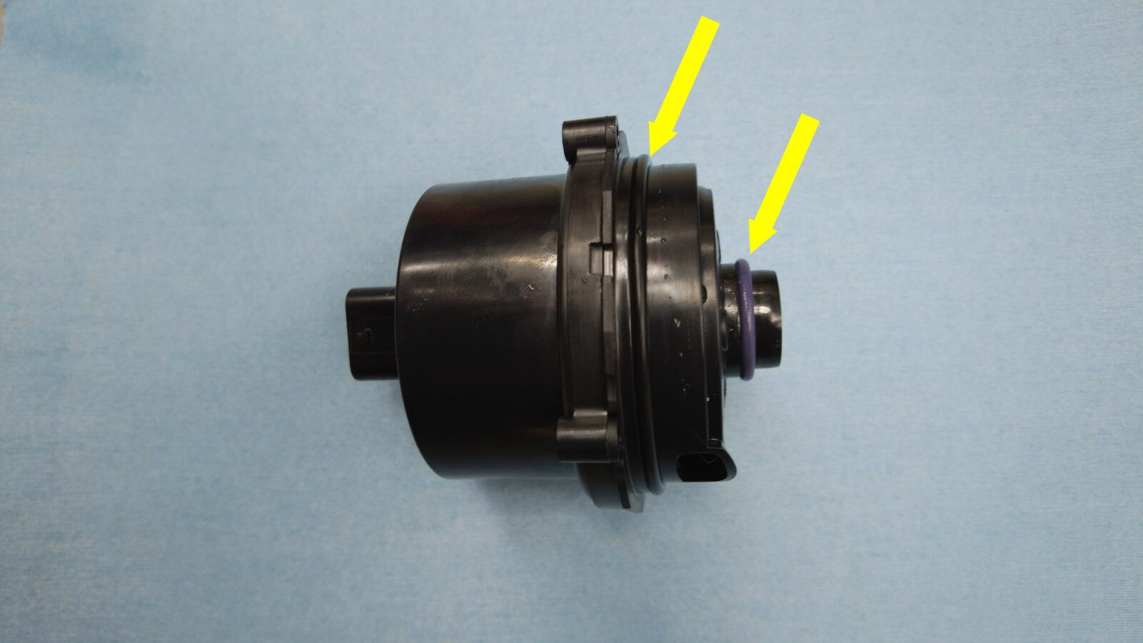 注使用 O 型环硅酮润滑剂润滑两个 O 型环,查看连接器位置,然后安装冷却液泵,注意连接器锁片应朝上。