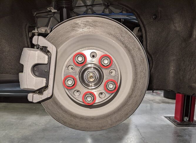 安装将左后制动盘固定到轮毂轴承的螺栓。
