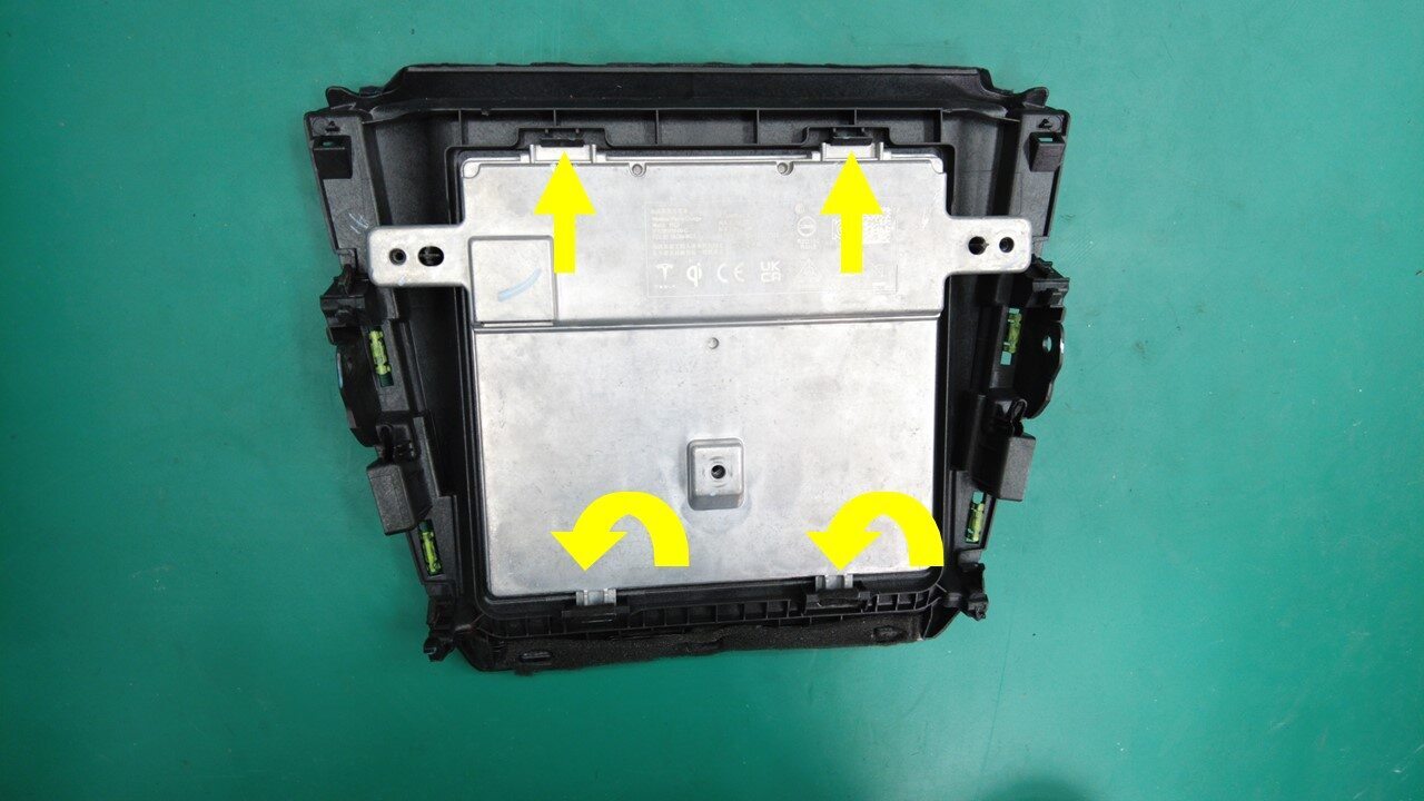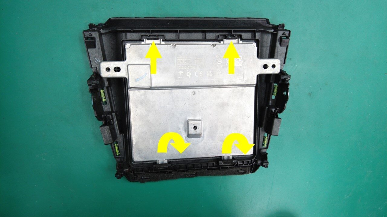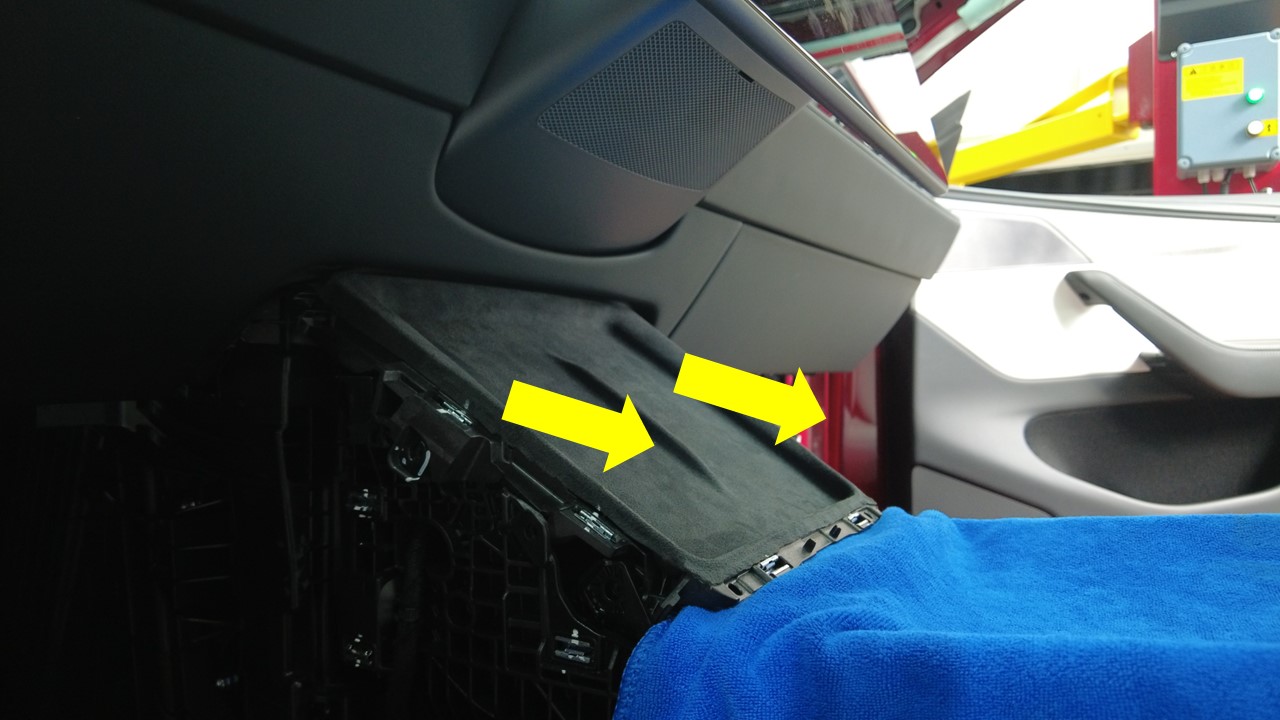 在滑门盖板上放置一块毛巾以防损坏,然后松开将手机托盘和充电器模块总成固定到中控台的锁片(6 个)和卡子(2 个)。