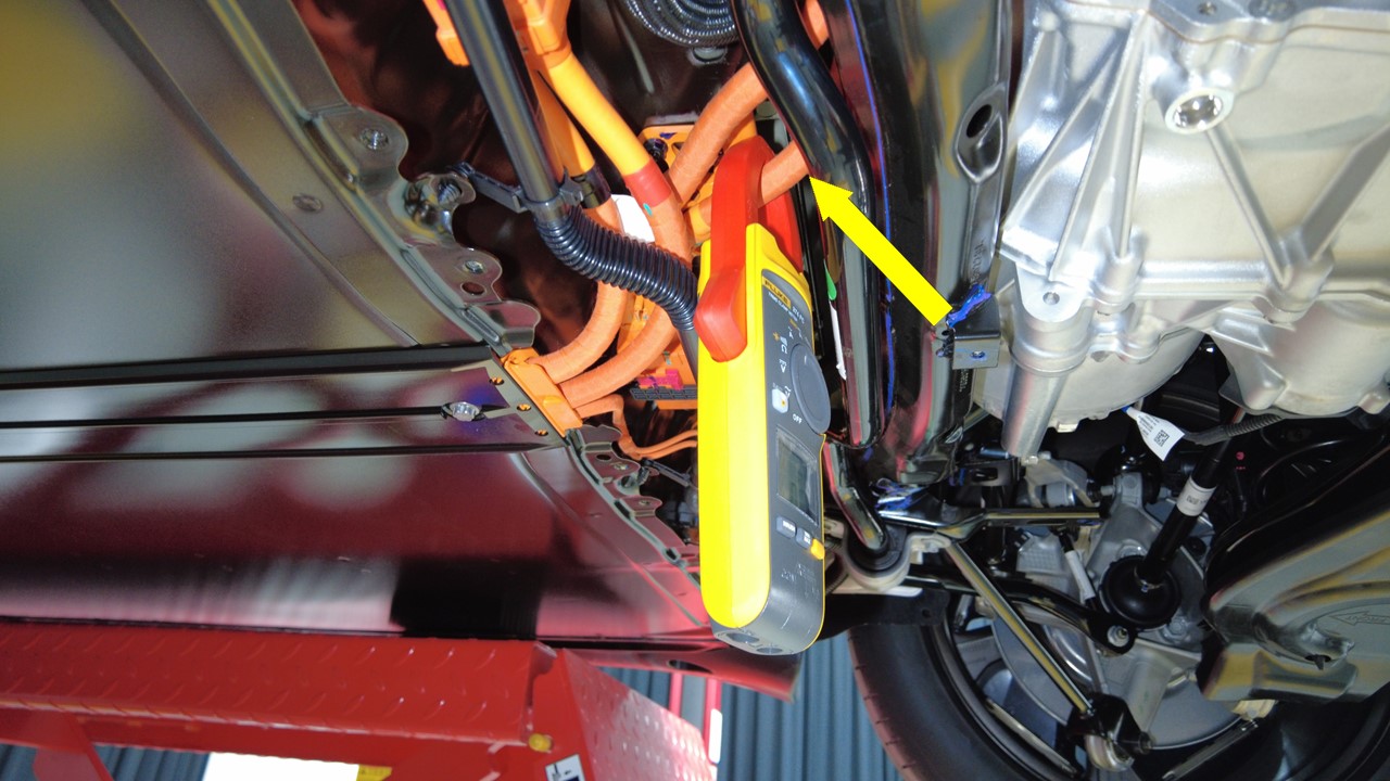 将电流钳仪表安装到后驱动单元高压线束的一条电缆上。
