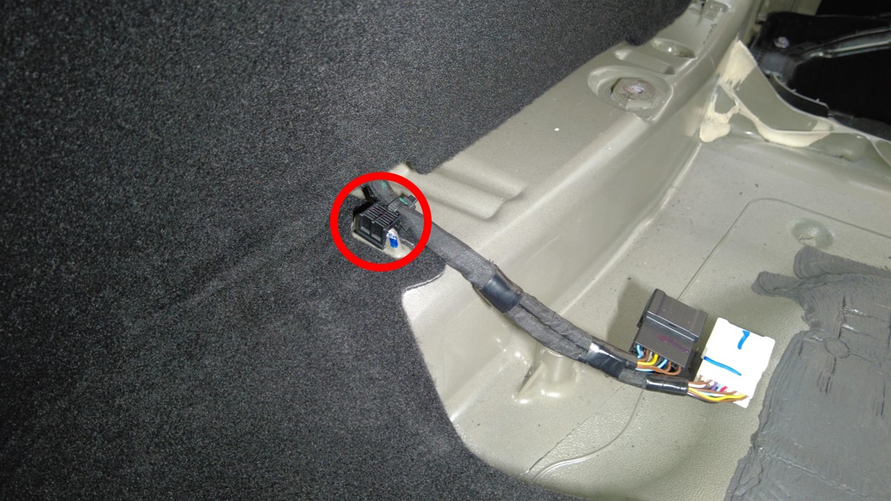 注安装地毯时,先将座椅接线线束穿过地毯,然后将地毯插入两侧的后备箱侧饰板下方。