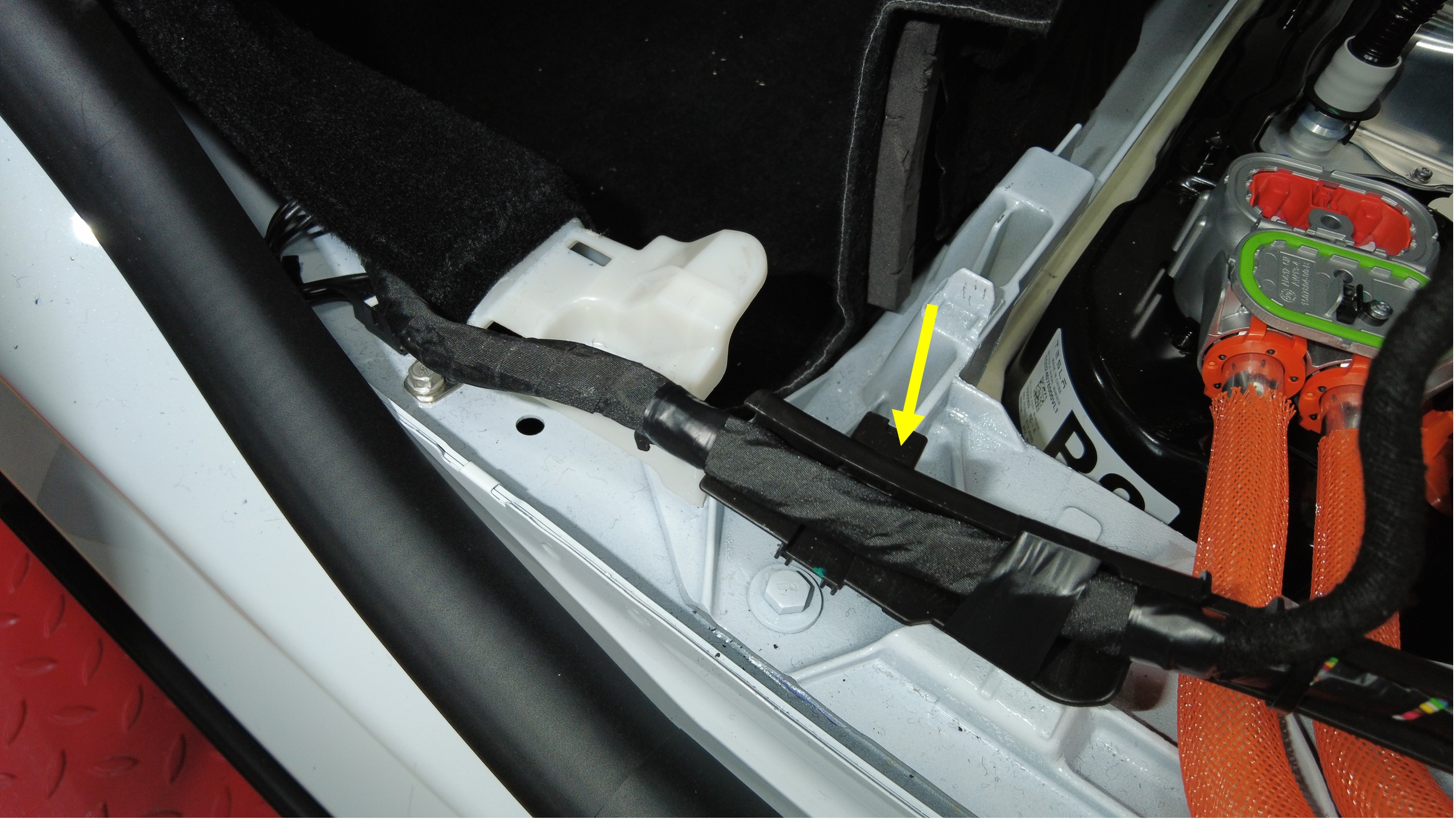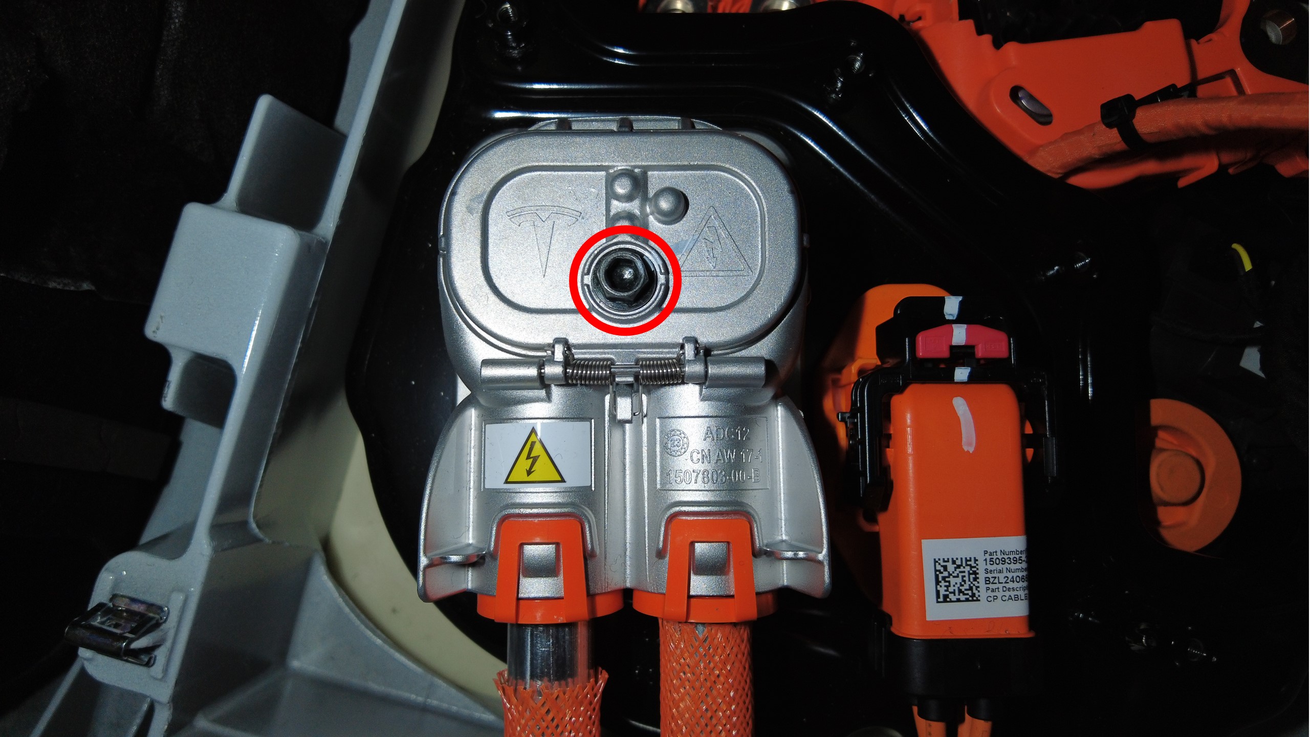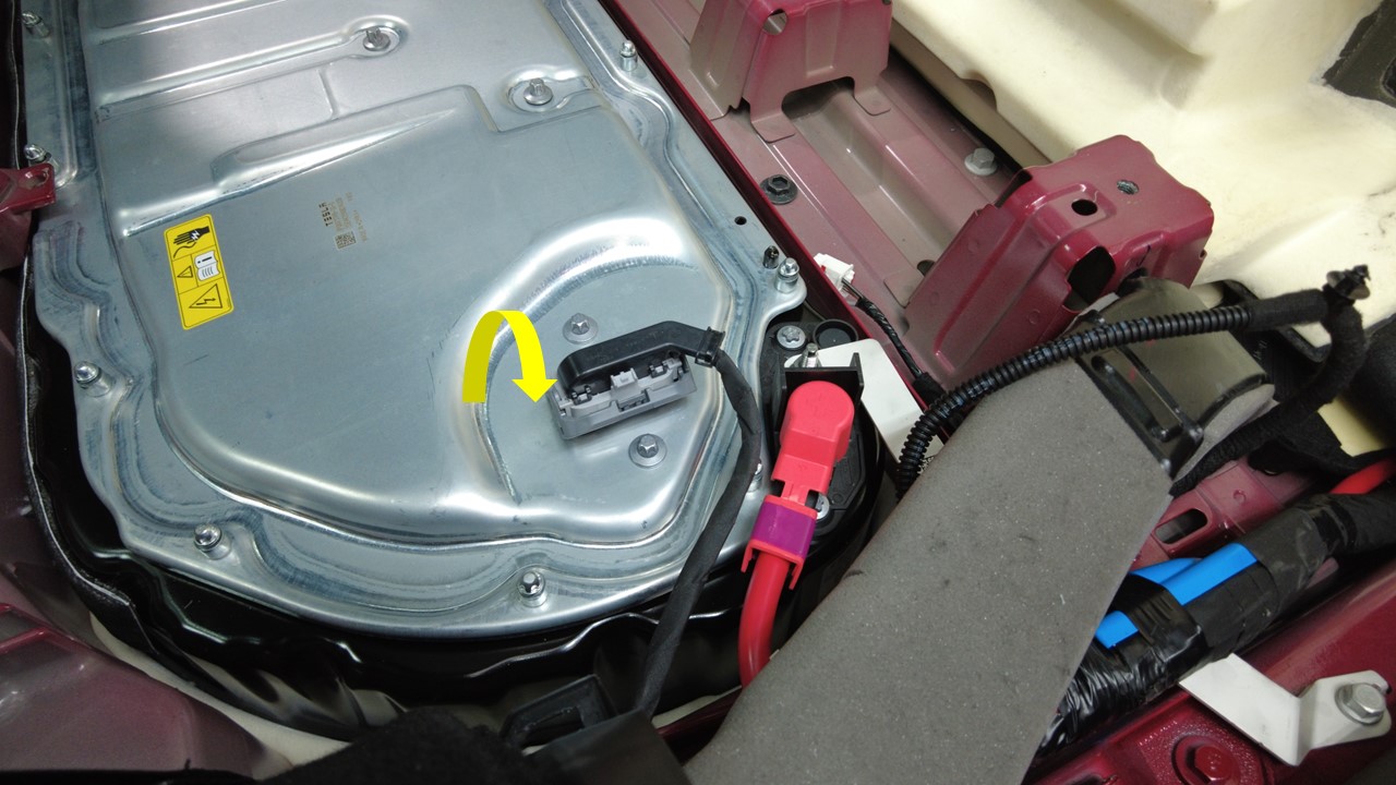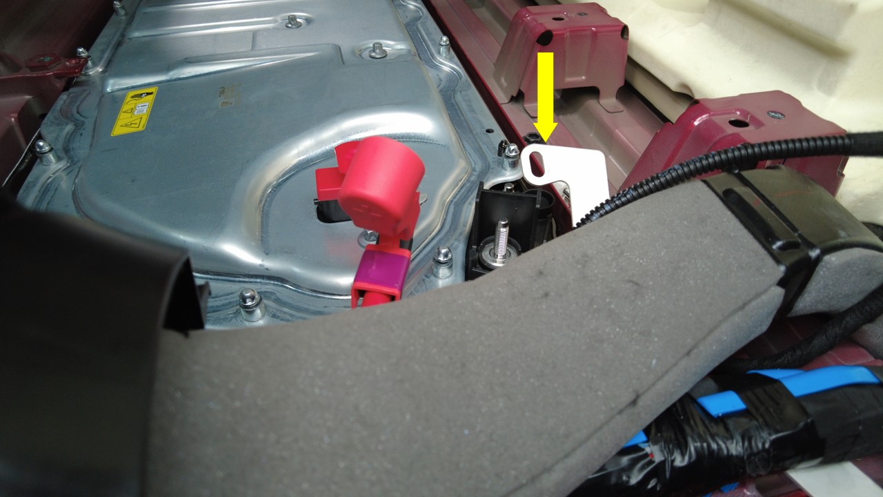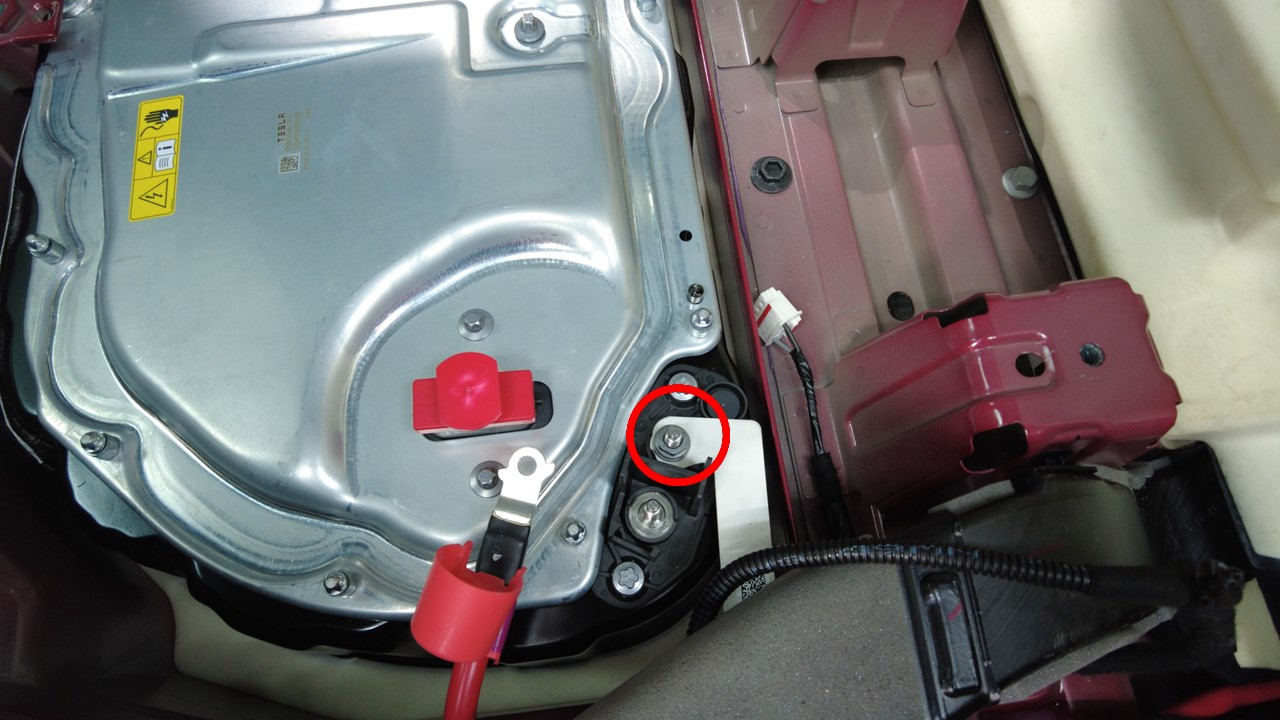 打开左前和右前座椅后部下方的地毯开口,以便接触高压电池内部中间螺栓。