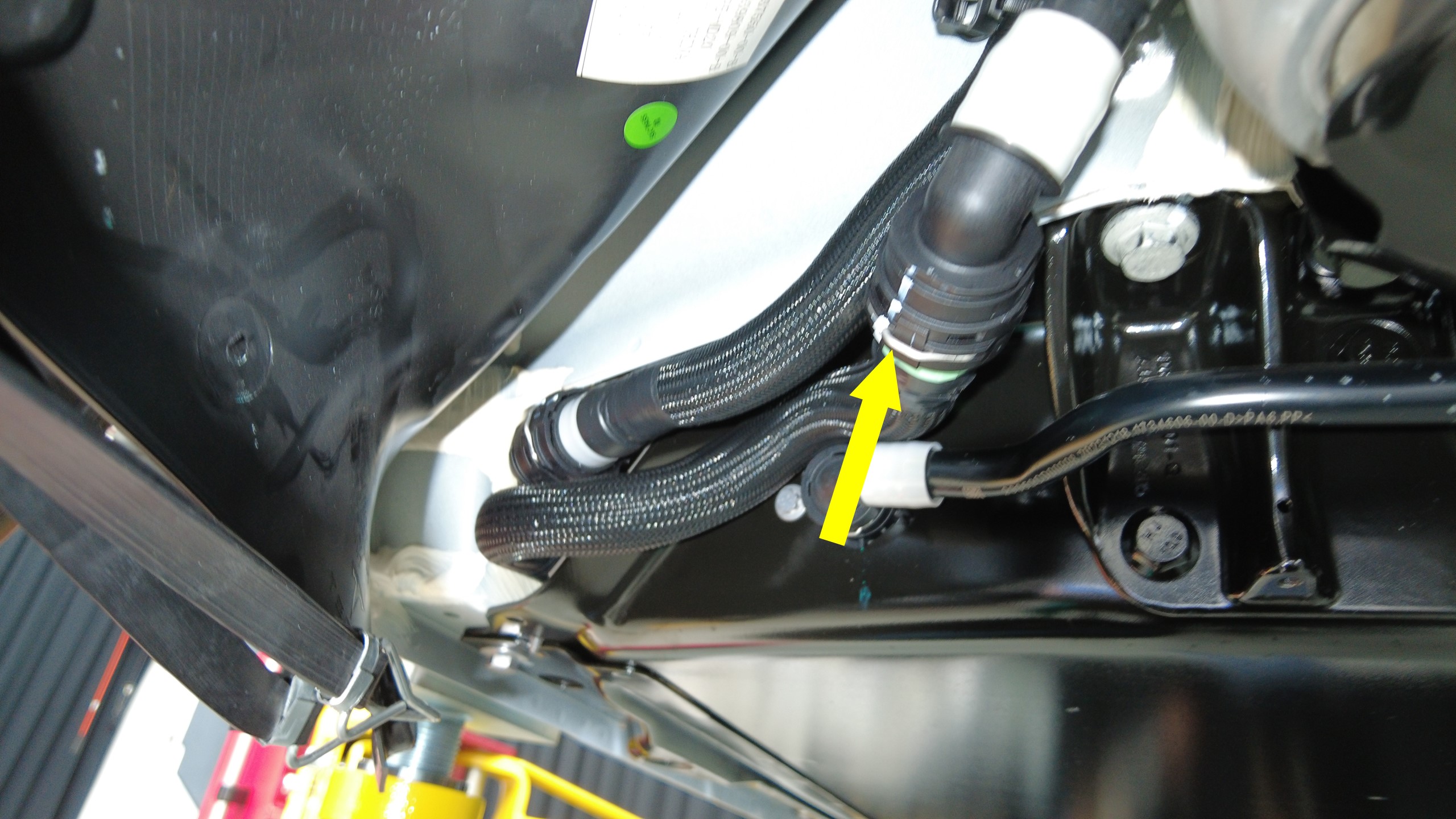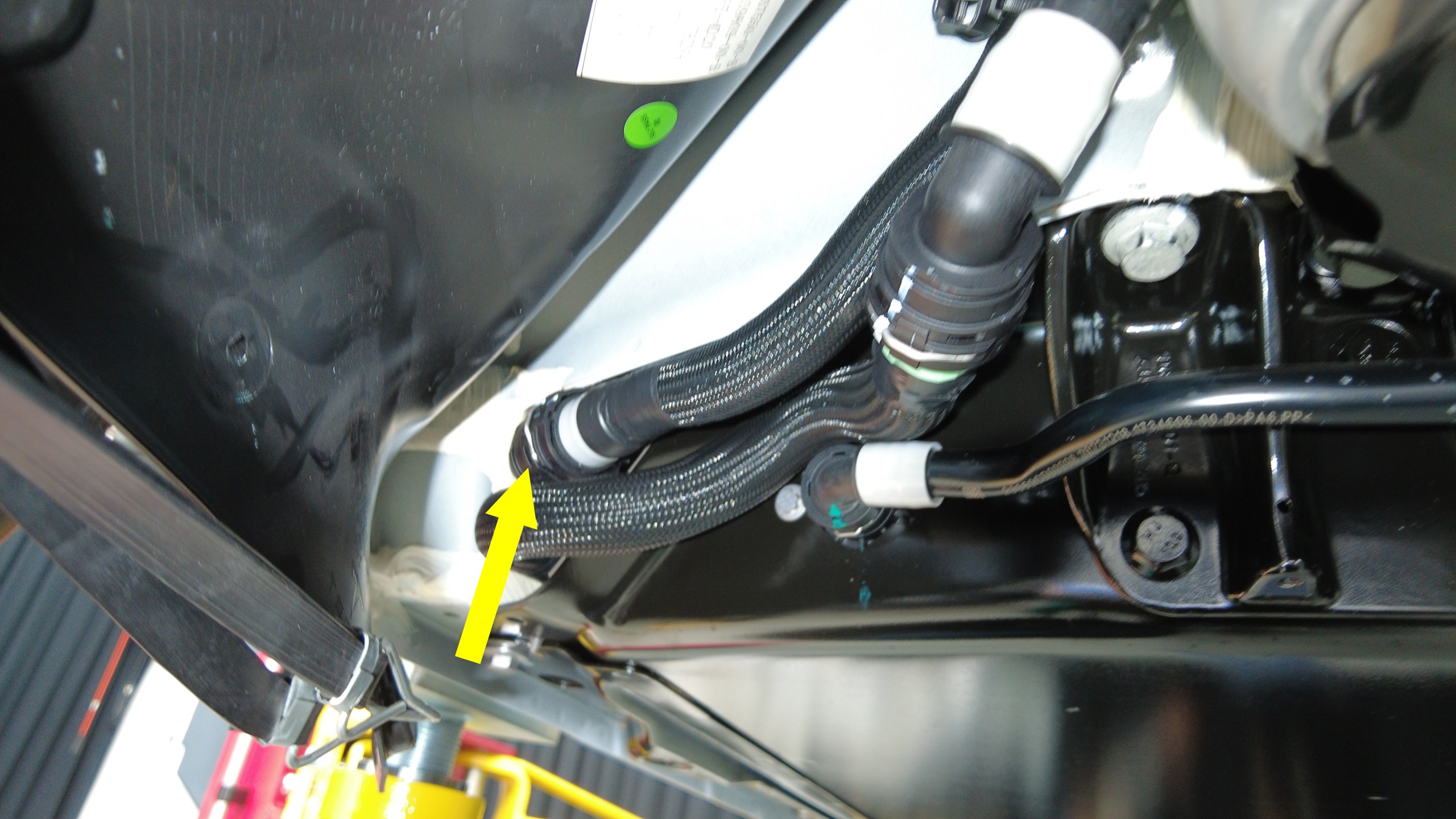 注执行推拉推测试,确保软管完全紧固。注必要时,用车间毛巾清洁右门槛板饰板内的任何残留冷却液。注如果冷却液流失量超过 1 升,则需要进行真空加注。