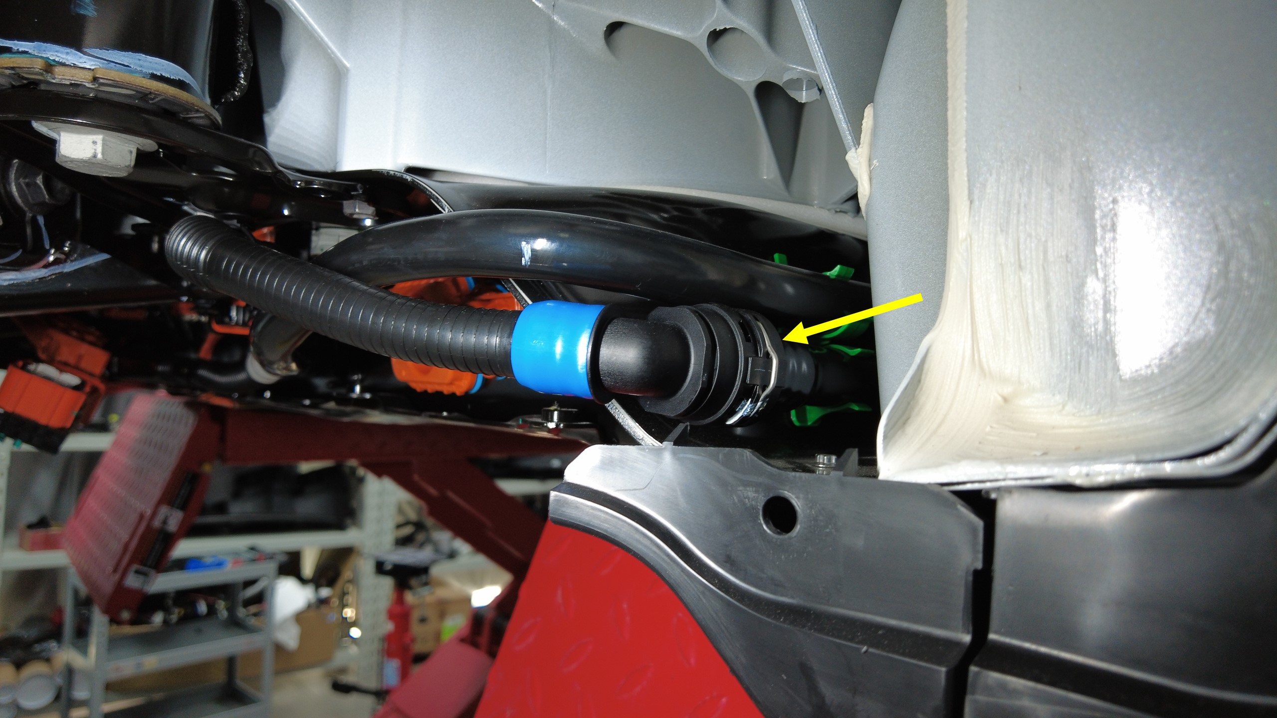 - 在高压电池 RH 前侧下方放置一个冷却液排放容器。