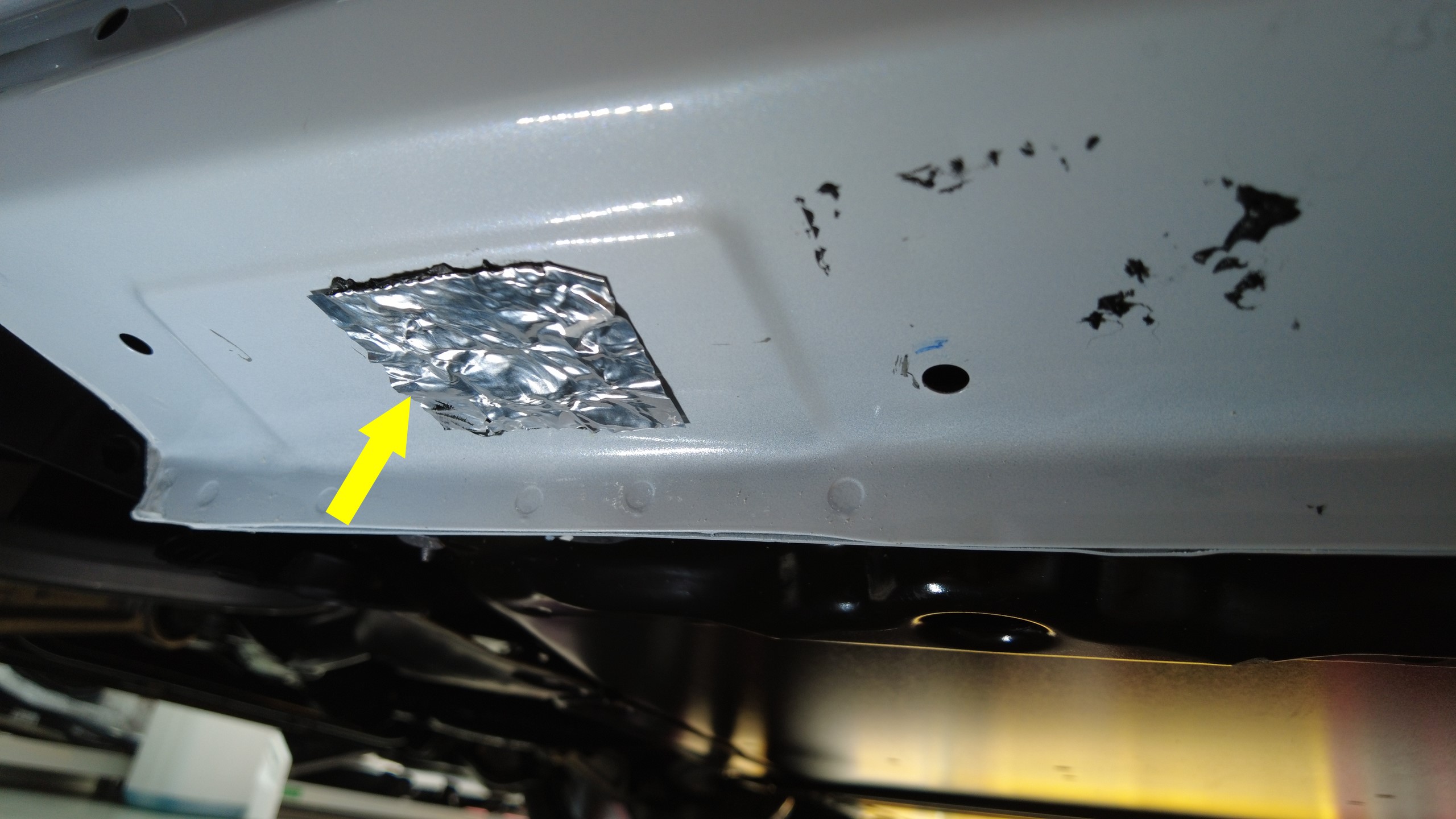 拆下并弃置用于覆盖左右门槛板饰板检修孔的丁基贴片(4 个),然后使用异丙醇 (IPA) 湿巾清洁区域内的多余丁基胶。