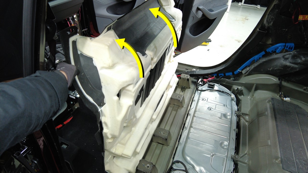 撬动拆下泡沫塞,以便接触高压电池内部左前螺栓。