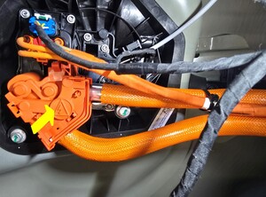 部分松开将后备箱左侧饰板固定到车身的卡子和定位销,断开电气连接器,以接触充电接口安全盖。