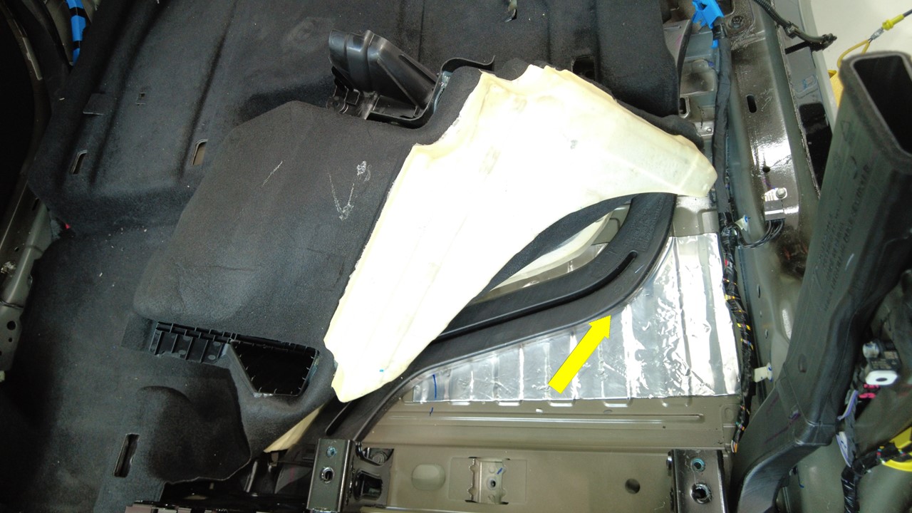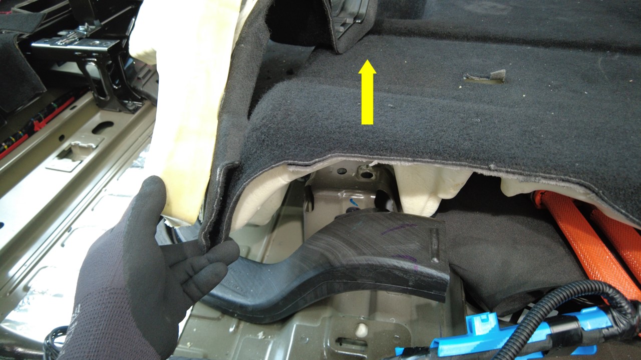 向上提起后部地毯的左侧,以安装将第三排左侧座椅 A 段风管固定到车辆的卡子。