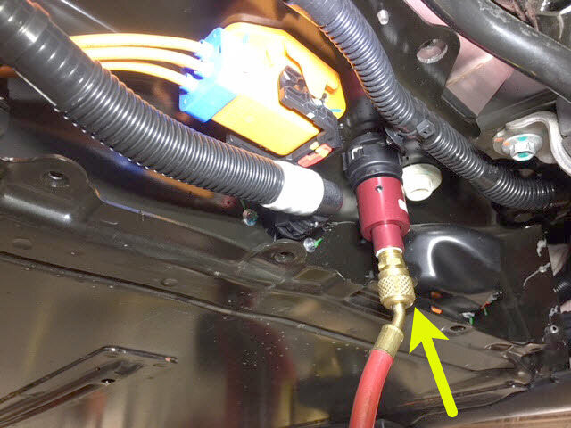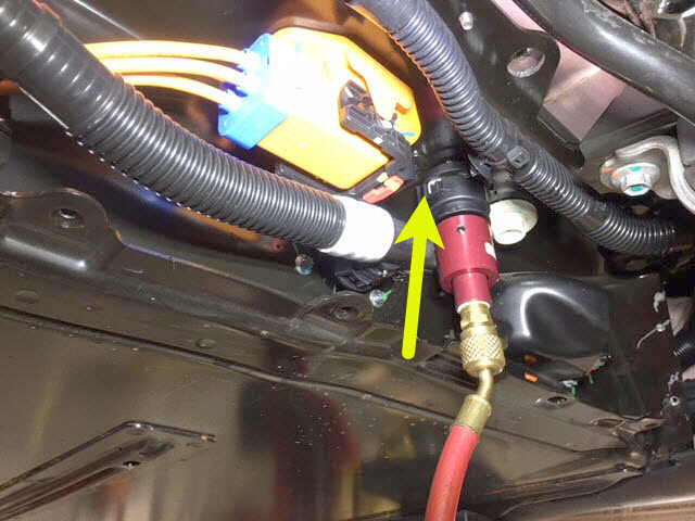 将冷却液压力测试适配器连接到高压电池仓右侧底部的外螺纹接头。