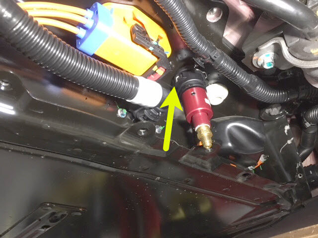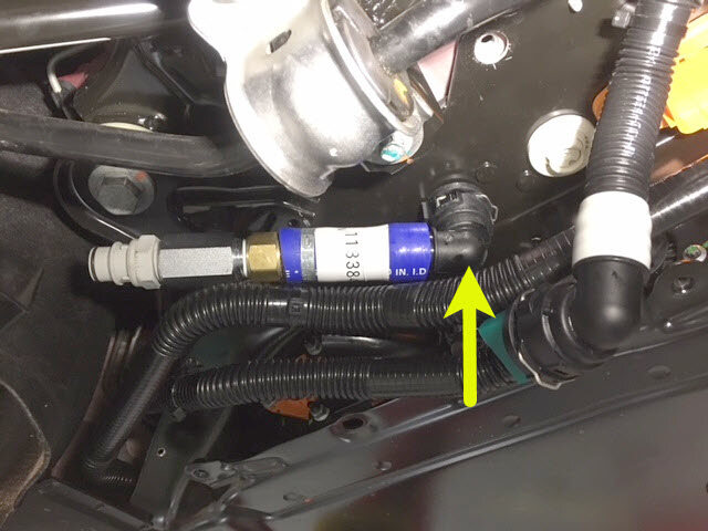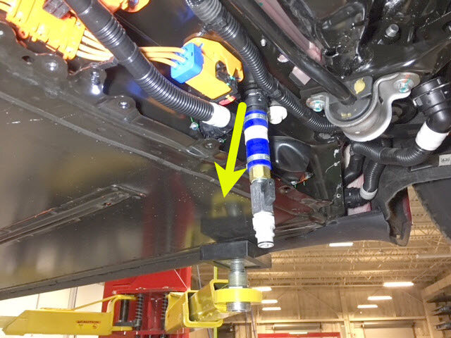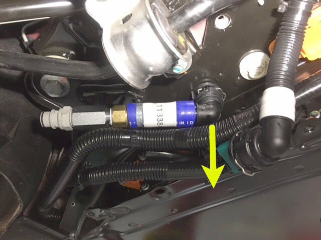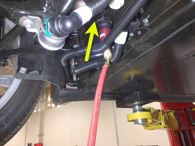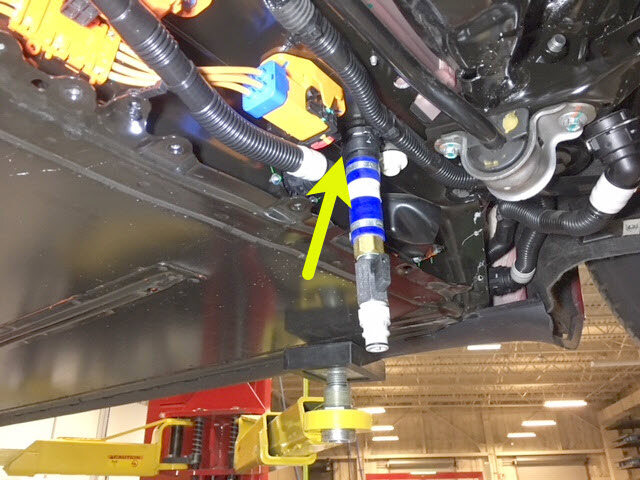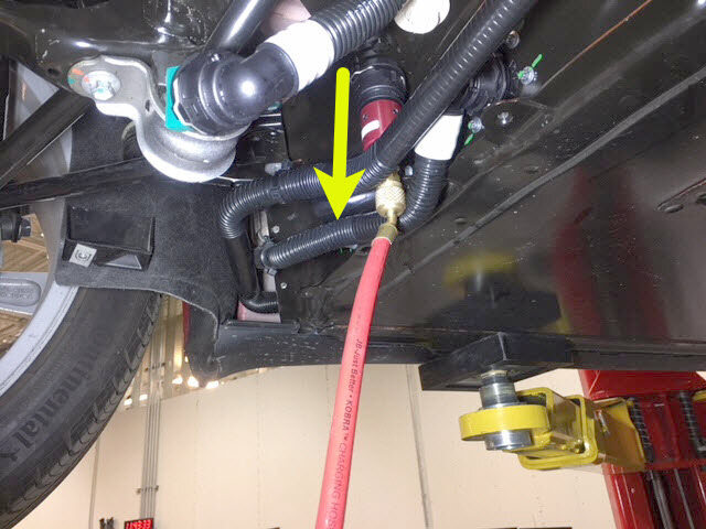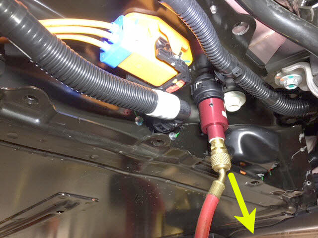 紧固卡子,然后将冷却液压力适配器连同出口空气软管一起连接到高压电池仓右侧底部的外螺纹接头。