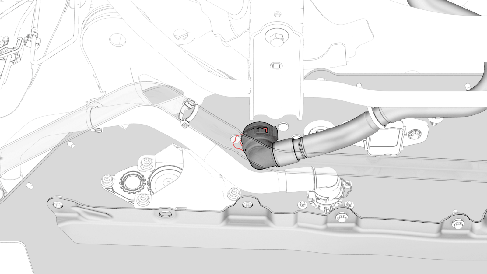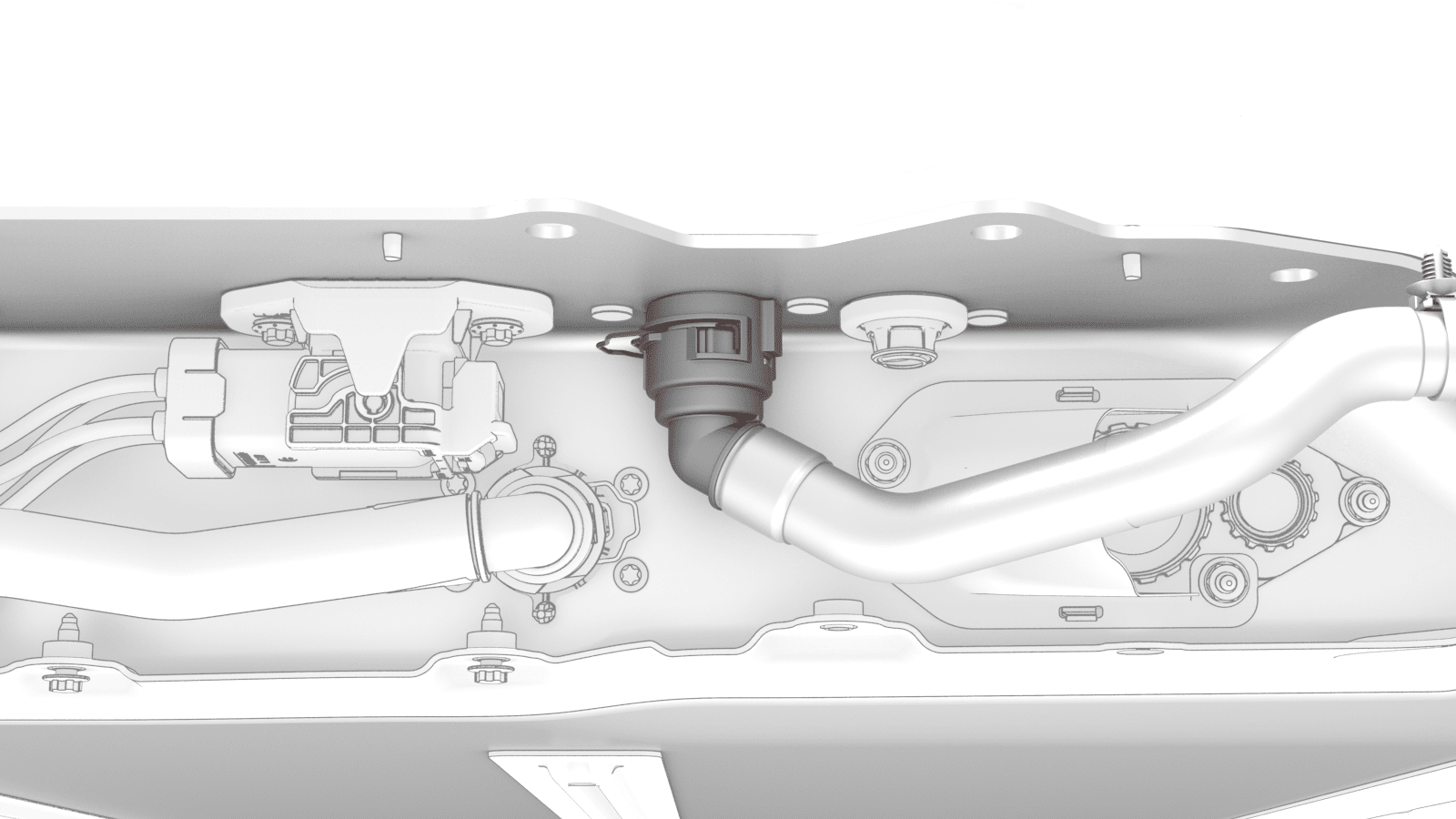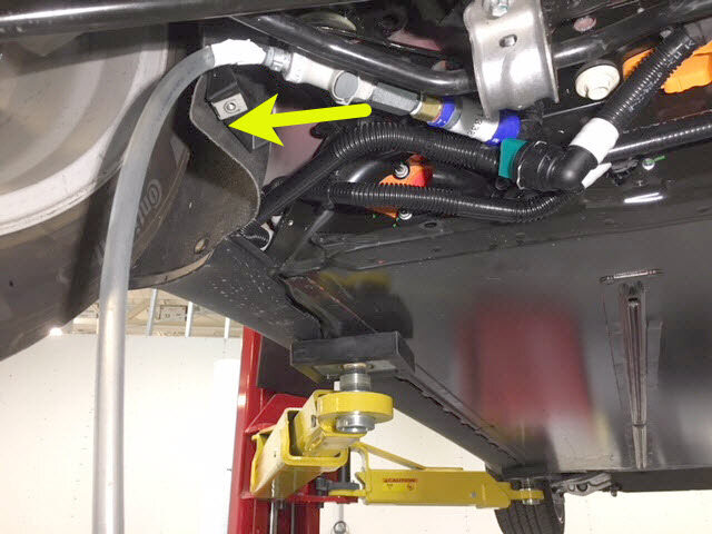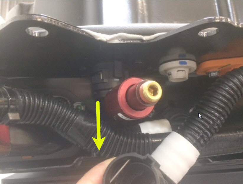 取下后动力总成供给软管的塞子,将软管连接到高压电池仓右侧底部的外螺纹接头,紧固卡子,然后对接头进行推拉推测试。