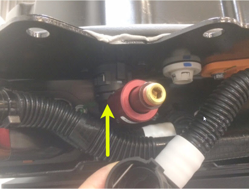 松开夹子,将冷却液压力适配器从高压电池仓右侧底部的外螺纹接头上松开。