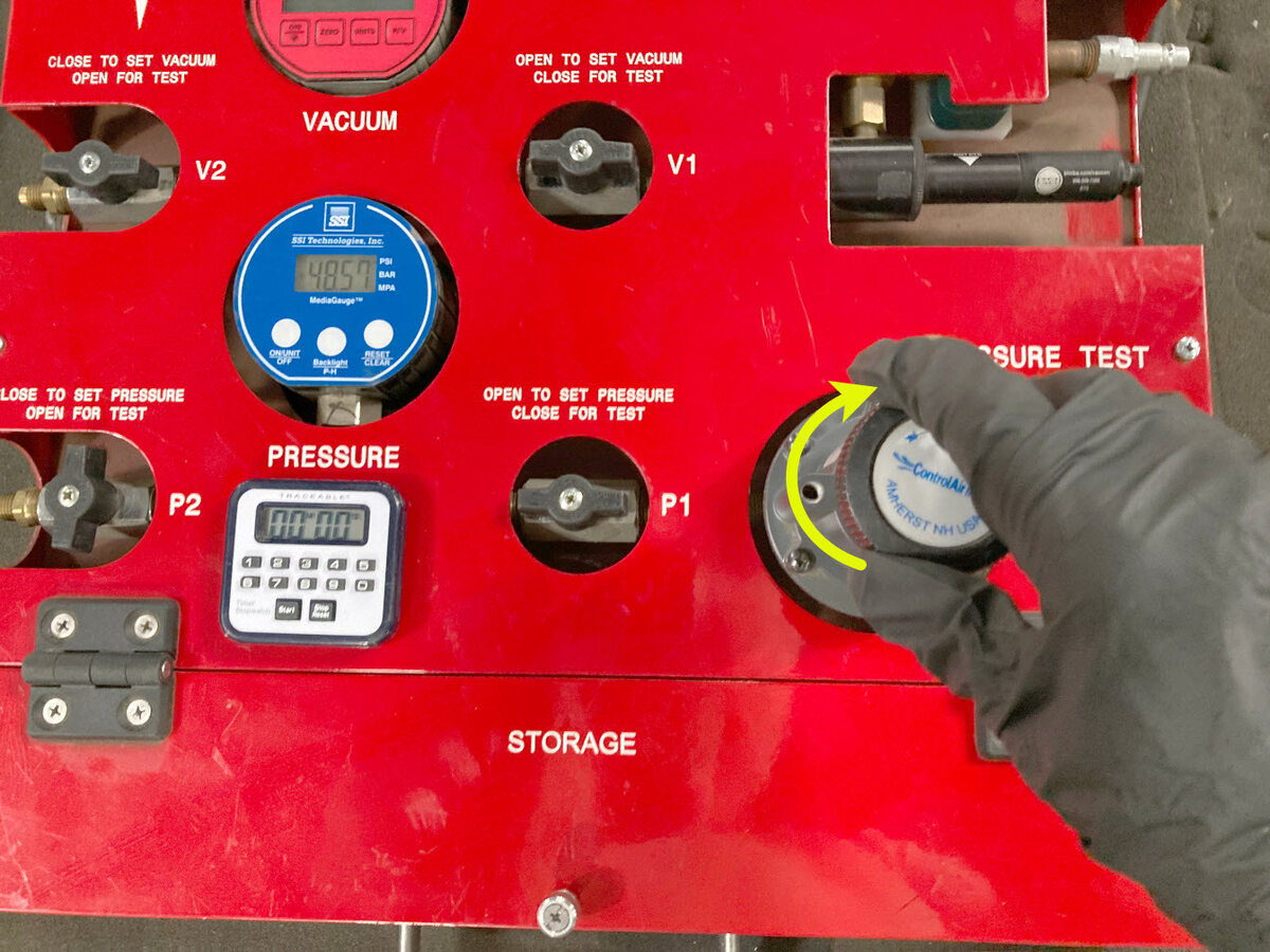 接通压力表电源,然后顺时针转动调压器旋钮,将压力设置为 50 PSI。